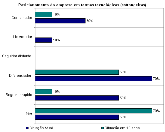 É extremamente interessante perceber como os executivos vêem o posicionamento de suas empresas em termos de inovação no presente e no horizonte de dez anos. Na situação atual prevalecem posicionamentos mais tímidos, como o de diferenciador, seguidor rápido (fast follower), ou de licenciador. Em dez anos, na grande maioria das empresas, prevalece a visão de ser líder em termos de inovação.