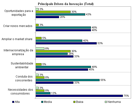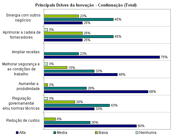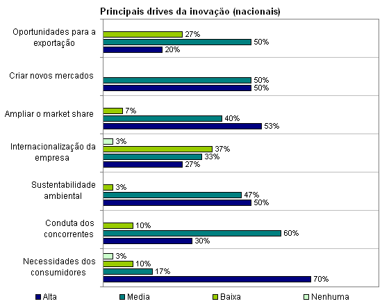 No seu conjunto, os executivos entendem que entre os principais drives da inovação estão a geração de receita, o aumento da produtividade, a necessidade dos consumidores, a redução de custos, a criação de mercados e a ampliação do market-share. Chama atenção para a baixa frequência de respostas que indicam o mercado exterior e a internacionalização das empresas como um destes determinantes da inovação. Dada a frágil inserção externa brasileira, o foco está claramente no mercado doméstico.