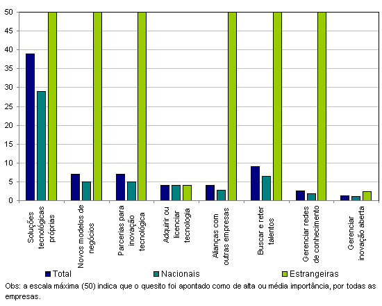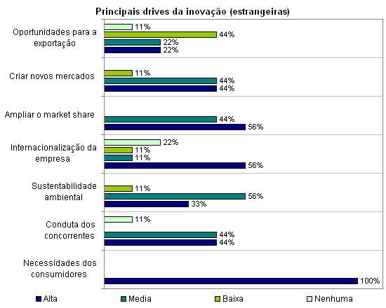 Principais Drives da Inovação das Subsidiárias de Empresas Estrangeiras. Entre as subsidiárias estrangeiras, as razões mais frequentes para inovar são atender as necessidades dos consumidores e ampliar receitas. Metade das empresas indica como de alta importância para inovar o desejo de ampliar o market-share, internacionalizar a empresa, melhorar as condições e a segurança do trabalho, criar novos mercados, reduzir custo ou a conduta dos concorrentes.