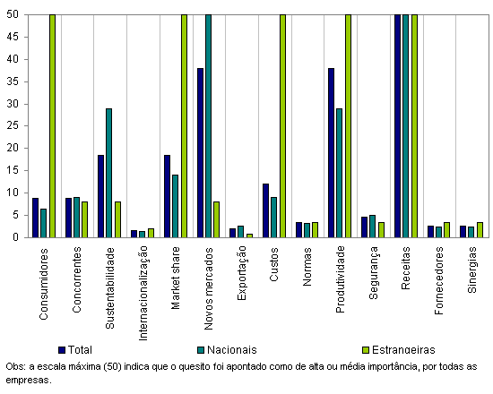 A concorrência aparece como tendo média-alta relevância, enquanto o aprimoramento dos fornecedores, a sinergia com outros negócios, ou ainda o atendimento às normas ou à regulamentação são tidos como de média importância. Novamente chama atenção, também para as empresas nacionais, que sejam menos frequentes as menções à internacionalização das empresas e à exportação, reflexo de seu foco no mercado doméstico.
