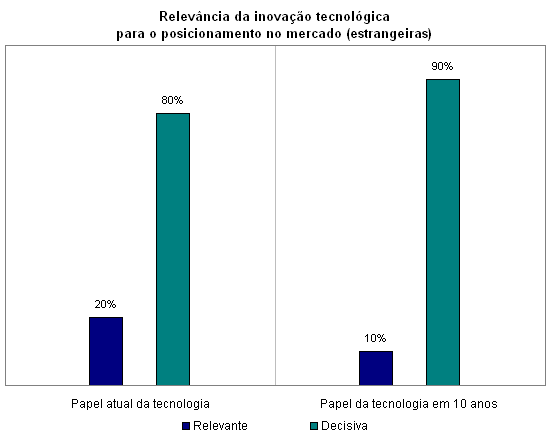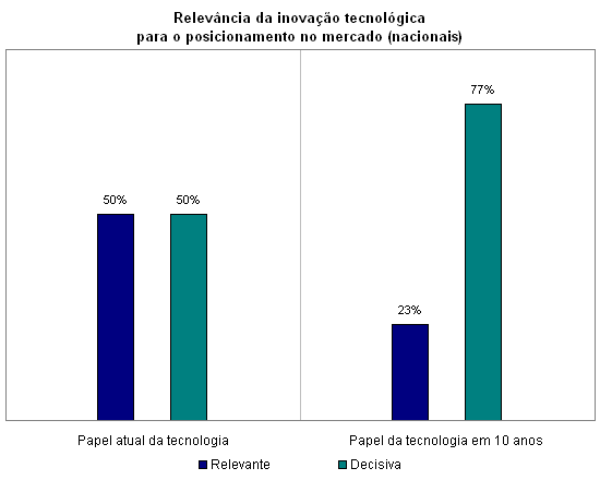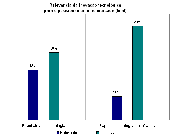 O mais interessante resultado do presente levantamento é que 58% das empresas entrevistadas consideram que a inovação tecnológica é decisiva para sua estratégia de mercado atual, enquanto 42% consideram a tecnologia relevante. Nenhuma empresa considera a tecnologia como pouco relevante ou irrelevante. No horizonte de dez anos, o entendimento se altera de forma ainda mais explícita: 80% das empresas entrevistadas consideram que a tecnologia será decisiva para sua estratégia de mercado futura e 20% consideram que este aspecto será relevante. Novamente, não há empresa que visualize, no futuro, que a inovação tecnológica será pouco relevante ou irrelevante.