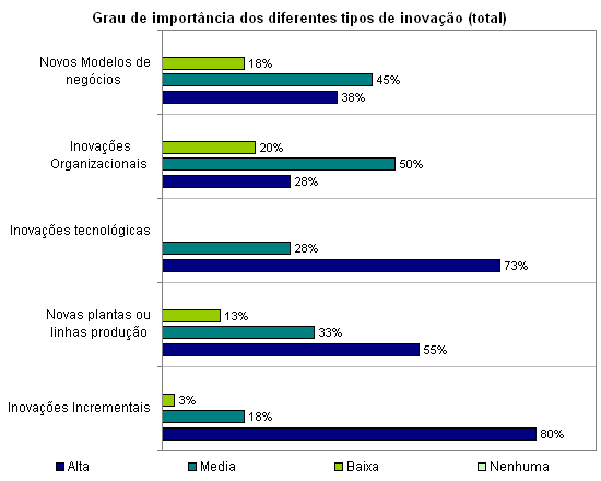 Grau de Importância dos Diversos Tipo de Inovação. As inovações que as empresas realizam são de diversa natureza. As relacionadas como mais importantes são as inovações incrementais e as tecnológicas. Mas também são relevantes inovações associadas aos investimentos em novas plantas e linhas de produção. Inovações organizacionais e novos modelos de negócios são de média importância, mas estão presentes na maioria das empresas.
