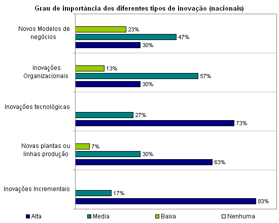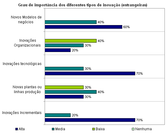 Grau de Importância dos Tipos de Inovação: Nacionais e Estrangeiras. Tanto no caso das empresas nacionais quanto estrangeiras, é maior o número de empresas que declaram como de alta importância as inovações incrementais e tecnológicas. O primeiro tipo de inovação tem até uma frequencia maior entre as empresas nacionais. Da mesma forma, é grande o número de empresas nacionais que consideram relevantes as inovações associadas aos investimentos em novas plantas e linhas de produção. Entre as estrangeiras é mais frequente considerar como relevante a inovação em novos modelos de negócios.