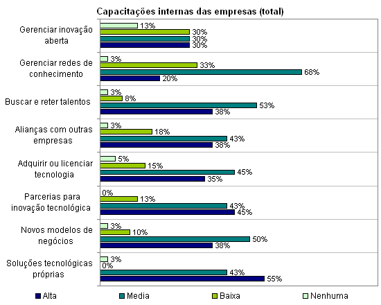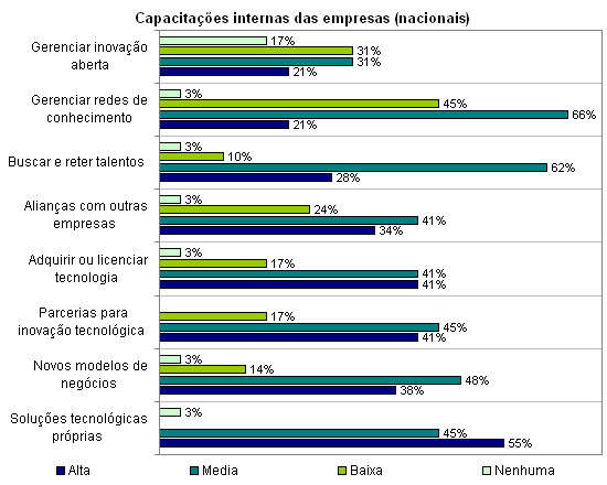 Capacitações Internas para Inovação. Quando questionados sobre a capacitação interna das empresas para tratar a inovação, 55% dos executivos consideram alta a capacidade de encontrar soluções tecnológicas próprias e 45% consideram alta a capacidade de fazer parcerias. Quando somados, o julgamento de que as empresas possuem alta e média capacidade para encontar soluções tecnológicas alcança 97%. Um único executivo declara que sua empresa não tem capacidade interna de encontrar soluções tecnológicas. Em grande parte das habilidades, o juízo dos dirigentes é de que a capacitação da empresa é média, tanto para gerir redes de conhecimentos, buscar e reter talentos, fazer alianças com outras empresas, adquirir ou licenciar tecnologias ou constituir novos modelos de negócios. O quesito que é mais frequentemente indicado como de baixa (30%) ou nenhuma qualificação (13%) é o de gerenciar inovações abertas.