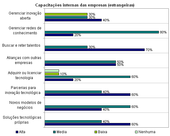 Escala das Capacitações para Inovação: Nacionais e Estrangeiras. Quando olhamos o mesmo resultado pela razão entre o número de empresas que declaram uma destas habilidades como alta ou média, em relação ao número que considera a mesma habilidade baixa ou nula, fica clara uma diferença grande entre grupos nacionais e estrangeiros. Em quase todos os quesitos, as subsidiárias consultadas consideram que suas capacitações internas são sempre altas ou médias, sem ocorrências de julgamentos de baixa ou nenhuma capacidade. Isso só não ocorre para a capacidade de gerenciar inovações abertas ou adquirir ou licenciar tecnologias. Para o subconjunto de empresas nacionais, ao contrário, o único quesito em que a avaliação dos executivos indica um claro pedomínio da alta e média capacitação interna é o de gerar soluções tecnológicas próprias.
