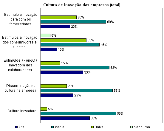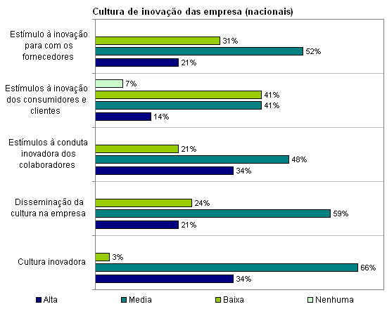 Também são poucas as empresas que declaram possuir uma clara cultura de inovação. E merece destaque o reconhecimento de que a difusão desta cultura é muito pequena no conjunto da empresa e entre fornecedores e clientes.