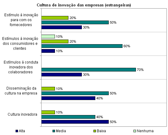 Cultura de Inovação: Nacionais e Estrangeiras. A comparação entre grupos nacionais e estrangeiros, acerca da visão que os executivos tem da cultura da inovação de suas empresas, revela que há diferencial sistemático a favor das estrangeiras. É sempre maior, nestas empresas, a frequência de dirigentes que considera existir uma forte cultura de inovação, ou que identifica sua difusão pela empresa, colaboradores, fornecedores ou clientes. É especialmente maior a frequência, entre as empresas nacionais, dos CEOs que consideram baixos os estímulos à inovação dos clientes, dos consumidores e dos fornecedores.
