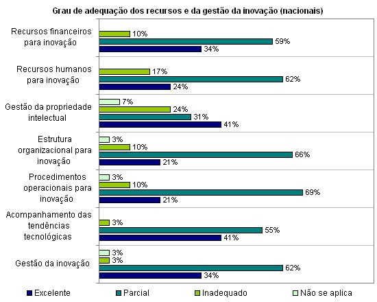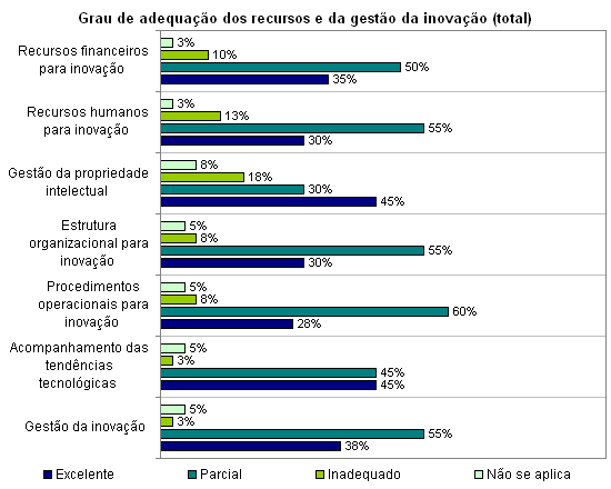 Adequação dos Recursos e da Gestão da Inovação. Na visão dos principais executivos das empresas, é muito frequente o diagnóstico de que a gestão e os recursos aplicados em inovação, em suas empresas, são apenas parcialmente adequados. Somente em dois quesitos avaliados, há uma maior frequência de dirigentes que consideram excelente o pocisionamento de sua empresa: na gestão da propriedade intelectual e no acompanhamento das tendências tecnológicas. Curisosamente, há também um elevado número de dirigentes que entendem que as ações de gestão da propriedade intelectual de suas empresas são inadequadas.