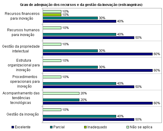 Adequação dos Recursos e da Gestão Nacionais e Estrangeiras. Há uma notável diferença na visão dos principais executivos das empresas nacionais e estrangeiras, acerca da adequação da gestão e dos recursos aplicados em inovação. Na maior parte das subsidiárias os dirigentes avaliam como excelente tanto a gestão, como os recursos financeiros e humanos alocados. Entre as empresas nacionais predomina a visão de que a gestão não é satisfatória e que os recursos atendem parcialmente ao que seria adequado. No universo das subsidiárias praticamente não há quesitos avaliados como inadequados. Mas eles aparecem com frequências não desprezíveis nas empresas nacionais, a exemplo da gestão da propriedade intelectual ou dos recursos humanos alocados.