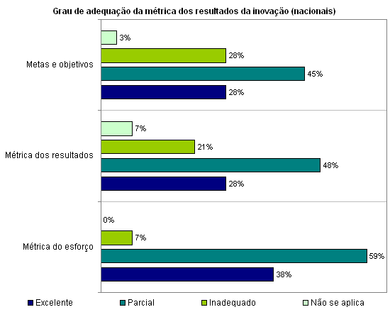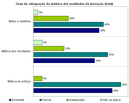 Métrica de Avaliação de Resultados da Inovação. A avaliação que os executivos fazem das métricas de avaliação dos resultados da inovação revela certa insatisfação quanto aos procedimentos adotados. De forma aproximada, a medida do esforço é considerada adequada por cerca da metade dos respondentes e parcialmente adequada por outra metade.