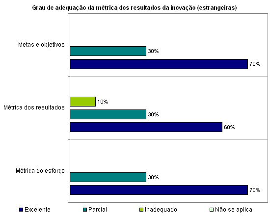 Métrica de Avaliação de Resultados da Inovação: Nacionais e Estrangeiras. Uma comparação entre as empresas nacionais e as estrangeiras, quanto à visão dos executivos acerca da métrica de avaliação de resultados da inovação, mostra uma grande diferença: em cerca de 60 a 70% das subsidiárias, os dirigentes se dizem satisfeitos tanto na medida de esforço, quanto na avaliação dos resultados e das metas e objetivos; ao contrário, entre as empresas nacionais predomina uma visão que de que estes três aspectos são apenas parcialmente satisfatórios. Há entre as empresas nacionais um número elevado de dirigentes que considera estas métricas inadequadas, em especial no que toca à na avaliação dos resultados e do alcance das metas e objetivos.