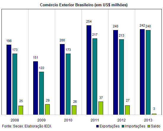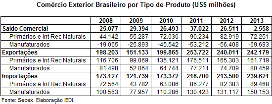 O aumento do déficit comercial com bens manufaturados decorreu da menor taxa de crescimento das exportações relativamente às importações. Com isso, esse déficit atingiu o recorde de US$ 69,9 bilhões em 2013 (três vezes superior ao de 2008) contra um superávit de US$ 72,6 bilhões na balança de bens primários e intensivos em produtos naturais. Ou seja, até 2013, o desempenho positivo dessa balança foi mais do que suficiente para compensar a deterioração progressiva da balança de bens manufaturados. Contudo, a piora nesse desempenho relativamente aos dois anos anteriores já sinalizava a possibilidade de ressurgimento de um déficit comercial em 2014, que acabou se concretizando.