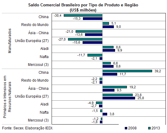 A abertura do saldo comercial por região de destino e origem mostra o aumento do déficit comercial de bens manufaturados com a China, demais países asiáticos, União Europeia e Nafta. No caso dos produtos primários e intensivos em recursos naturais houve aumento significativo do superávit com a China e com os demais países asiáticos, redução do superávit com União Europeia, aumento do déficit com a Aladi e surgimento de um saldo também negativo com o Nafta. Assim, o saldo comercial positivo até 2013 foi obtido graças ao aumento do superávit com bens primários e intensivos em recursos naturais com países em desenvolvimento da Ásia, em especial a China, que mais do que compensou o déficit na balança de bens manufaturados com esses países, a União Européia e o Nafta. Contudo, o dado que mais chama atenção é a influência crescente da China no desempenho da balança comercial dos dois grupos de produtos: em 2013, o maior déficit em manufaturados e o maior superávit em primários e intensivos em produtos naturais foram registrados com esse país.