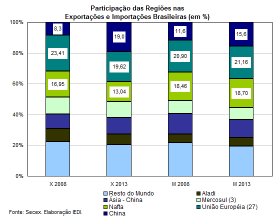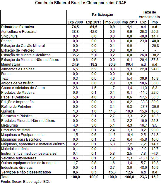 Ambos os resultados estão estreitamente associados à intensificação dos fluxos comerciais com a China e ao perfil assimétrico das exportações brasileiras para esse país e das importações chinesas de produtos brasileiros. Em 2013, o maior déficit em manufaturados e o maior superávit em bens primários e intensivos em produtos naturais foram registrados com a China, cuja participação no total das exportações e das importações brasileiras aumentou continuamente entre 2008 e 2013, atingindo nesse último ano 20% e 15%, respectivamente.