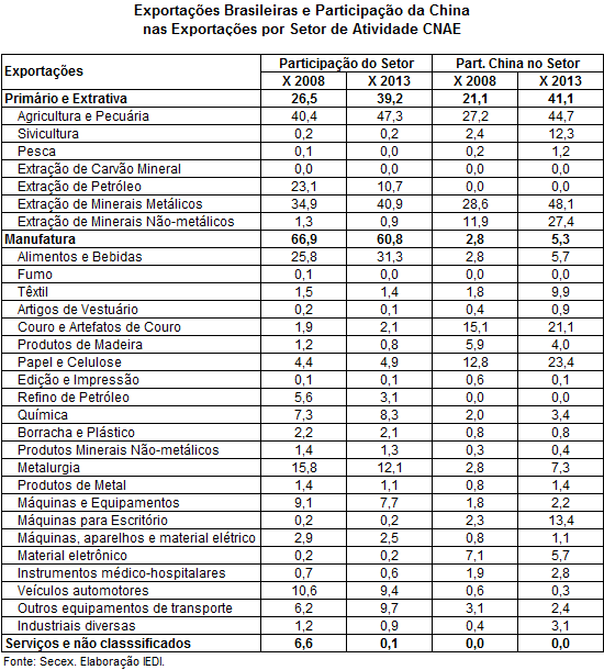 No caso das exportações, a participação dos bens primários e da indústria extrativa aumentou 12,7 pontos percentuais (p.p), de 26,5% em 2008 para 39,2% em 2013. Esse aumento ocorreu pari passu com o crescimento do peso da China nas vendas externas desses bens (de 21,1% para 40,1%), com destaque para agricultura e pecuária e extração de minerais metálicos. Entre 2008 e 2013, enquanto a participação desses segmentos no total avançou 6,9 p.p e 6,0 p.p, respectivamente, o peso da China nas respectivas exportações aumentou 17,5 p.p e 19,5 p.p.