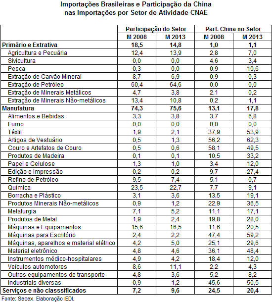 Já os setores que registraram aumento do déficit foram exatamente aqueles que ampliaram sua participação nas importações: têxtil; artigos de vestuário; química; borracha e plástico; produtos de metal; máquinas e equipamentos; máquinas para escritório; máquinas, aparelhos e material elétrico; material eletrônico e; indústrias diversas. Conjuntamente, eles passaram a responder por 70% do total, contra 63% em 2008. Ao contrário do observado nas exportações, esses são setores com maior elaboração industrial, nos quais a China tem vantagem comparativa, com destaque para química, material eletrônico e, sobretudo, máquinas e equipamentos (cujas importações aumentaram 21% entre 2008 e 2013, resultando num aumento de participação de 11,6% para 16,4% no mesmo período).