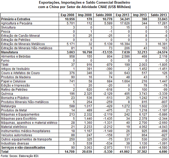 A intensificação dos fluxos comerciais com a China no período analisado teve um impacto líquido positivo no resultado do comércio bilateral com esse país. Esse saldo, que era deficitário em US$ 5,3 bilhões em 2008 tornou-se superavitário em US$ 4,7 bilhões em 2013. Os principais setores responsáveis por essa inversão foram Agricultura e pecuária, extração de minerais metálicos, alimentos e bebidas e metalurgia, os quais ampliaram sua participação nas exportações brasileiras para a China no período analisado (de 84% em 2008 e para 90% em 2013). Vale ressaltar que esses são setores de menor elaboração, nos quais o Brasil tem inequívoca vantagem comparativa, com destaque para Agricultura e pecuária e extração de minerais metálicos (com participações de 42% e 39% nas exportações para a China em 2013).