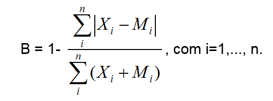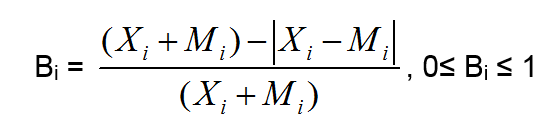 O indicador utilizado foi o índice de Grubel-Lloyd (IGL), que se baseia na decomposição do comércio total em uma parcela de comércio equilibrado (sobreposição entre exportações e importações) e uma parcela de comércio desequilibrado (superávit ou déficit). O IGL ao nível de cada indústria (produto) pode ser representado da seguinte forma: