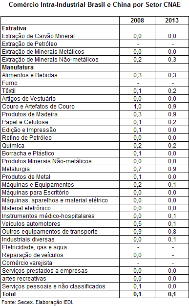 Na análise do comércio bilateral China-Brasil, também é interessante avaliar a importância do comércio intra-industrial. O comércio entre países com graus de desenvolvimento e/ou estruturas produtivas muito diferentes tende a ser de produtos de setores diferentes, isto é, inter-industrial. Em contrapartida, o comércio entre países com graus de desenvolvimento e/ou estruturas produtivas semelhantes tende a ocorrer com produtos dos mesmos setores, isto é, intra-industrial. Assim, os indicadores de comércio intra-industrial fornecem elementos para a compreensão das características desse comércio e da estrutura industrial subjacente.
