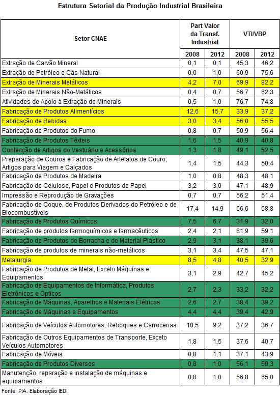 Na comparação de 2008 e 2012, não houve mudança significativa na estrutural setorial da produção industrial brasileira. Nos dois anos, os setores mais importantes no valor da transformação industrial (VTI) foram alimentos e bebidas, refino de petróleo e veículos automotores. Já os setores com maior penetração de importações provenientes da China foram química, máquinas e equipamentos e material eletrônico, os quais registraram uma ligeira queda ou estabilidade no VTI (caso de máquinas e equipamentos).