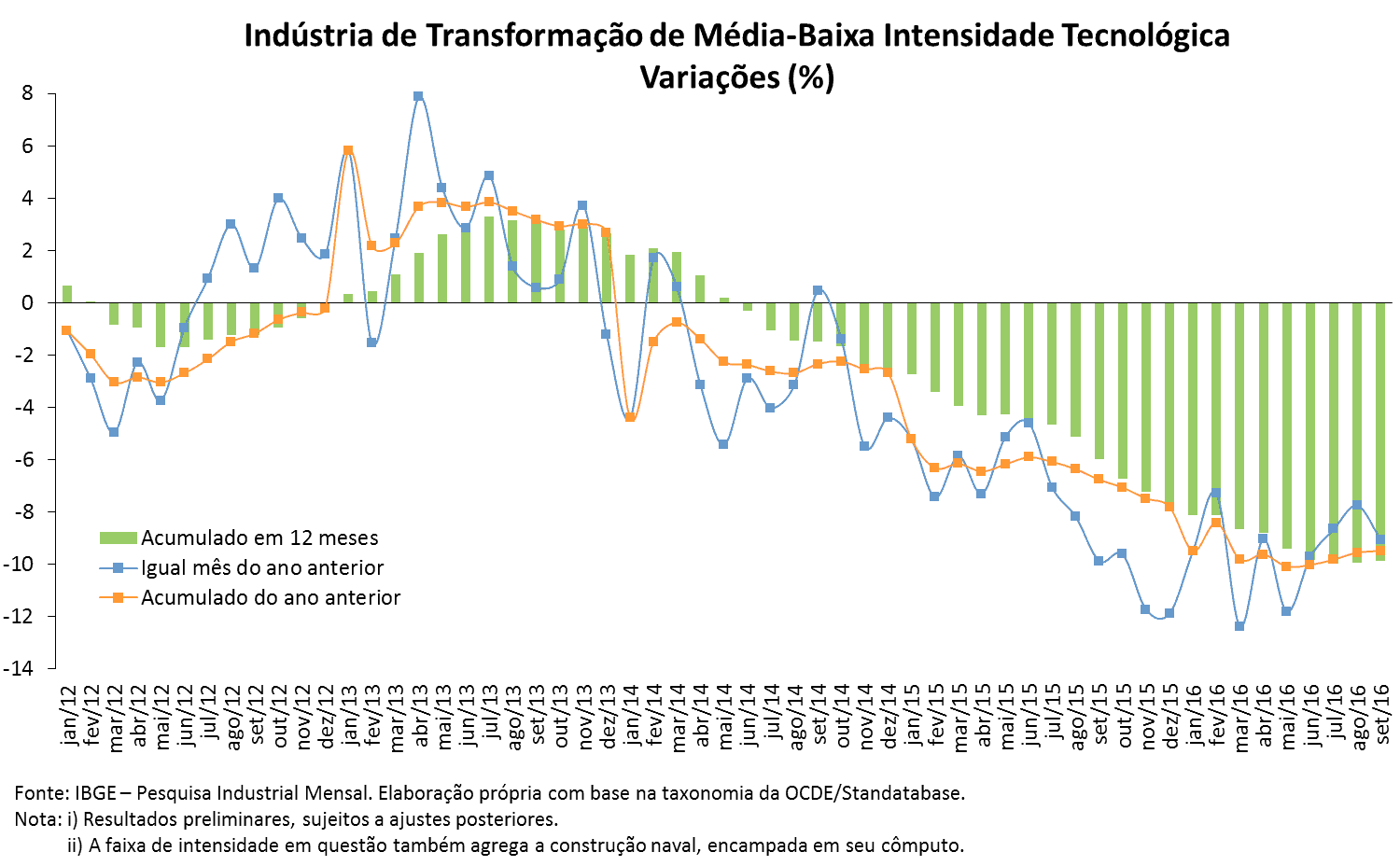 O segmento tecnologicamente mais intensivo nos termos da OCDE sofreu retração de 9,8% em janeiro-setembro de 2016. Em setembro a taxa foi de -9,4%, queda maior do que a registrada para todo o terceiro trimestre na comparação com igual período de 2015: redução de 7,3%. Em doze meses, o declínio foi de 12,4%. Por sinal, pelo acumulado em doze meses, desde julho de 2005, a produção física não ficava tão baixa. Já o déficit comercial dos bens tipicamente oriundos dessa faixa, ficou em US$ 13,5 bilhões no acumulado até setembro, o menor déficit para esse período do ano desde 2009. A queda nas importações concorreu bastante para tanto, enquanto as vendas externas em dólares correntes cresceram 9,2%, puxadas pelas exportações da indústria aeronáutica. A maior parte das atividades da faixa de alta intensidade produz bens complexos com várias etapas, compondo extensas cadeias globais de valor, como as da própria aeronáutica e as do complexo eletrônico.