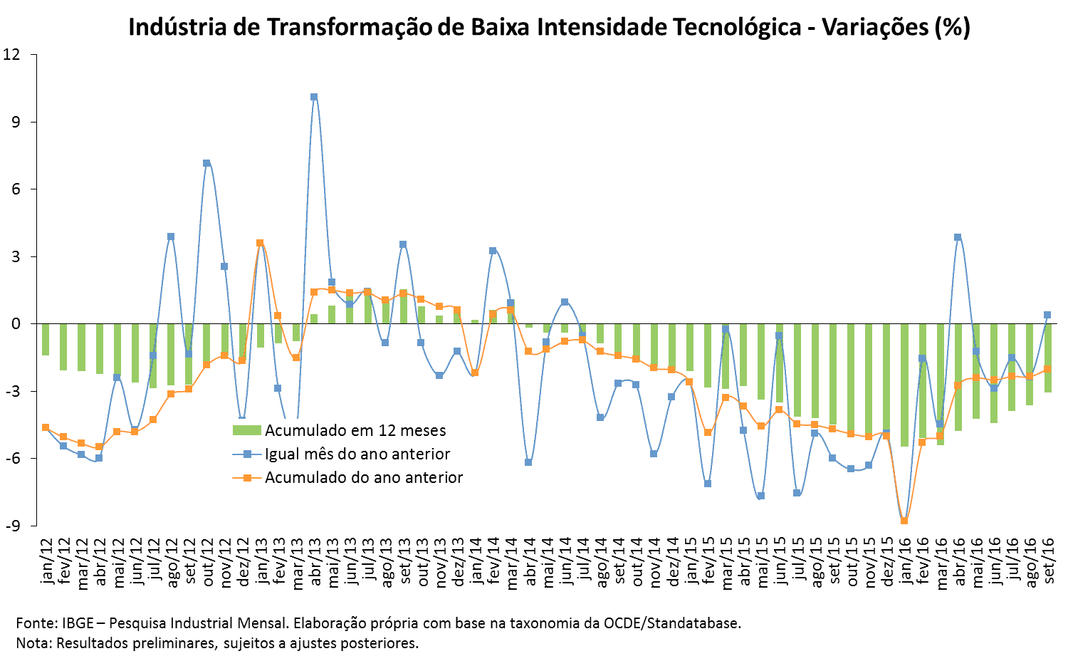 A produção da indústria de baixa intensidade tecnológica diminuiu 2,0% em janeiro-setembro vis-à-vis igual acumulado de 2015. Com tal queda, o patamar em que ficou foi o pior registrado para os três primeiros trimestres desde 2003. No nono mês, até houve crescimento, de 0,4%, o que dirimiu um pouco a variação negativa não só no acumulado do ano, mas também em julho-setembro (taxa de -1,2%). Em doze meses, a variação atingiu -3,1%. O saldo das mercadorias tipicamente produzidas por atividades dessa faixa, de US$ 29,3 bilhões, em janeiro-setembro permanece como o único superavitário dentre os quatro segmentos por intensidade tecnológica. Suas exportações cresceram 3,3%.