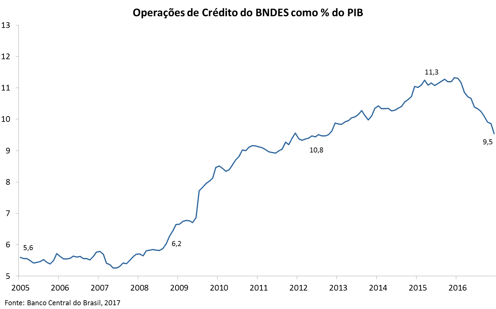 A participação do BNDES no sistema financeiro nacional tem sido expressiva. Em dezembro de 2016, por exemplo, 19,4% de todos os empréstimos bancários no Brasil foram financiados com recursos do BNDES. No entanto, esse nível de participação variou bastante ao longo do tempo, como entre o final de 2004 e meados de 2008, um período de rápido crescimento do mercado de crédito total, quando caiu de 21,9% para 15,7%.