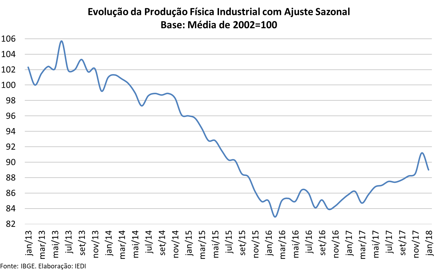 O ano de 2018 começou mostrando que o percurso da recuperação industrial não está livre de obstáculos. O declínio acentuado de janeiro, já descontados eventuais efeitos sazonais, rompeu com uma sequência de resultados quase sempre positivos desde o início do ano anterior, sendo as únicas exceções os meses de março e de agosto, quando a produção ficou em virtual estabilidade.