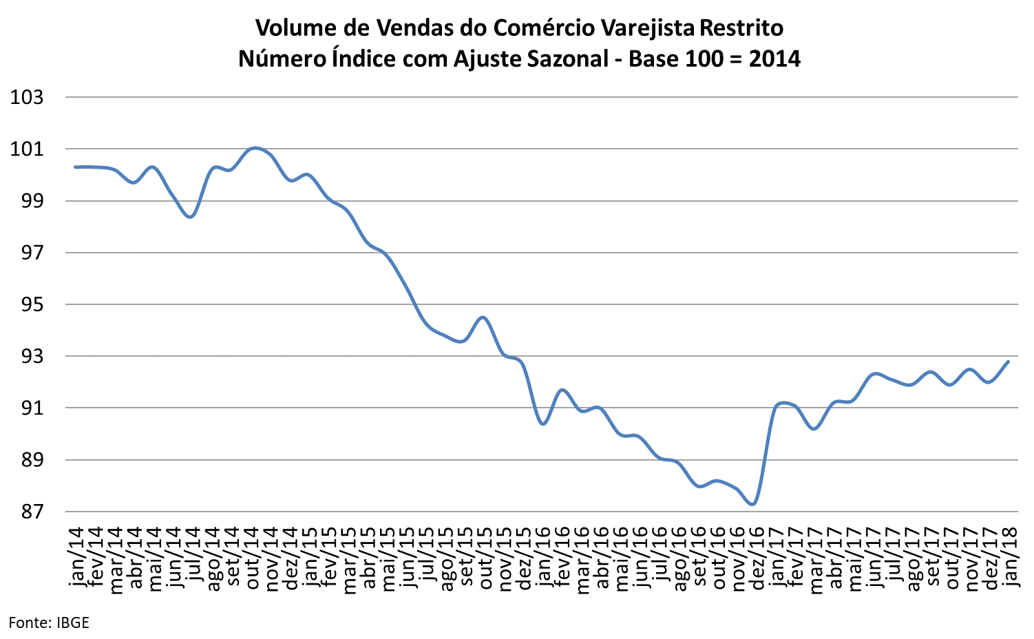 Uma ponderação a ser feita é que dezembro do ano passado havia sido um mês excepcionalmente bom para alguns setores, principalmente para a indústria, mas também, em certa medida, para os serviços. Em janeiro de 2018, já descontado os efeitos sazonais, o declínio foi generalizado: -2,4% na produção industrial, -1,9% no faturamento real dos serviços e -0,1% no volume de vendas do comércio varejista, tomado em seu conceito ampliado. Se desconsiderarmos as vendas de veículos, autopeças e material de construção, o chamado varejo restrito até que conseguiu ficar no azul: +0,9% frente a dezembro.