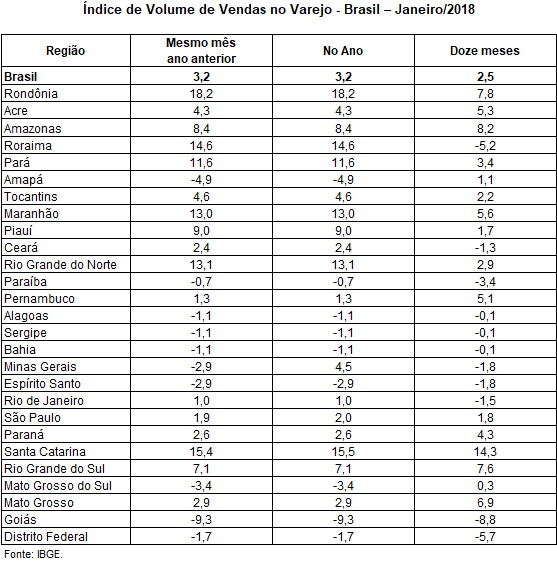 Cabe ainda considerar que os resultados positivos foram bastante difundidos entre os segmentos do comércio varejista na comparação interanual, atingindo, em janeiro do corrente ano, 8 dos 10 ramos acompanhados pelo IBGE que compõem o varejo em seu conceito ampliado e 19 dos 27 estados da federação.