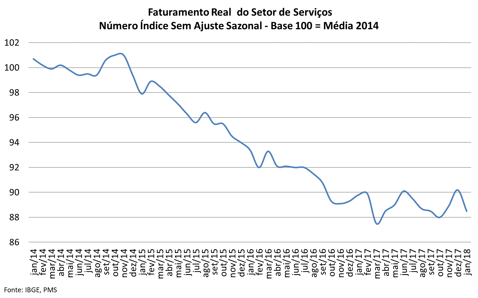 Deste modo, os serviços ficaram um pouco mais longe de vislumbrar o início de sua recuperação. Na série com ajuste sazonal, o desempenho de janeiro de 2018 (-1,9%) só não foi pior do que o de maio de 2017 (-2,7%), revertendo, ao menos parcialmente, o resultado positivo obtido em novembro e dezembro (+1,0% e +1,5%, respectivamente). Contou muito para isso, devido a seu peso no setor, o recuo de 3,0% nos serviços de transportes, cuja atividade refletiu a perda de dinamismo industrial em janeiro.