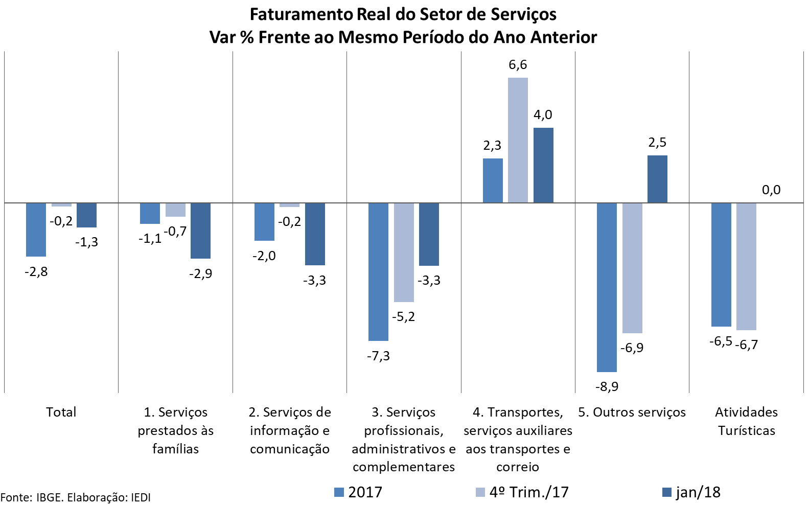 O segmento de outros serviços, que reúne um conjunto diversificado de atividades, também saiu do terreno negativo em janeiro de 2018: +2,5% contra -6,9% no 4º trim./17. No mesmo caminho, está o grupamento especial de atividades turísticas, mas neste caso o melhor que conseguiu foi ficar estável depois de uma sequência de 12 meses negativos, gerando uma retração acumulada de 6,5%.