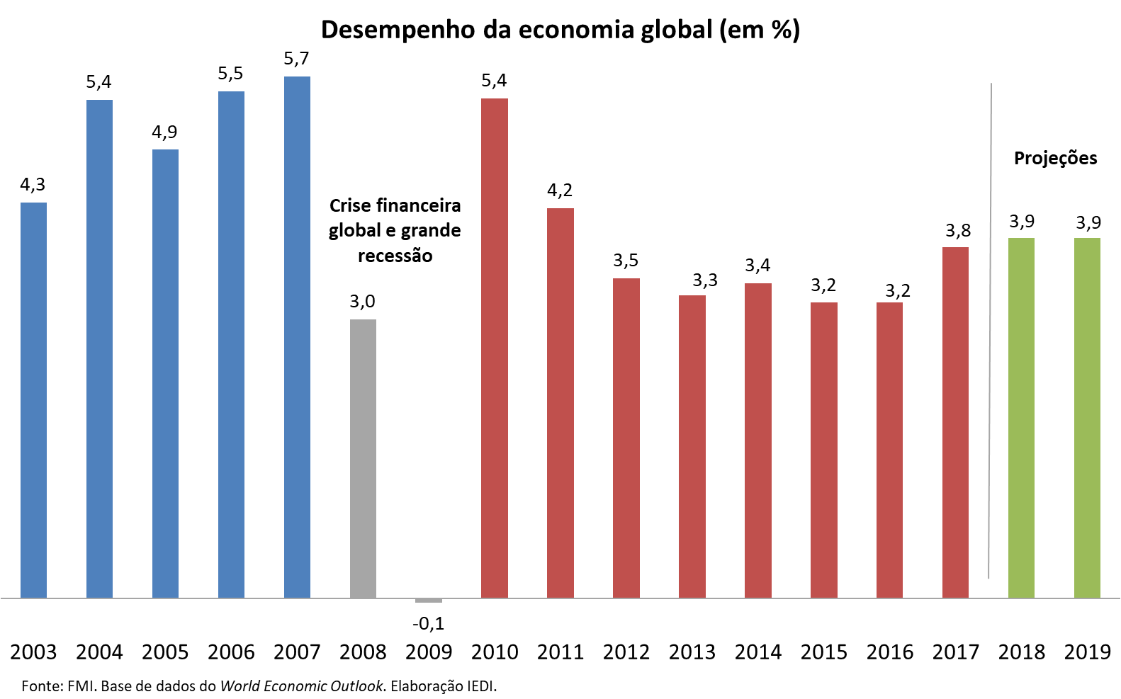 Também vale destacar que, além do crescimento em 2017 ter sido o mais elevado desde 2011, ele foi bastante disseminado: dois-terços dos países, responsáveis por três-quartos do PIB global, registraram maior crescimento em relação à 2016, a proporção mais elevada desde 2010. Além disso, se essas projeções se confirmarem, o triênio 2017-2019 apresentará o maior e mais estável patamar de expansão após a crise financeira global e a grande recessão (2010-2011), mas ainda inferior ao registrado no boom que precedeu essa crise.