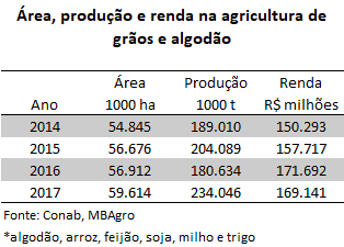 menor que a do ano anterior. No entanto, a área cultivada, que é o que está sob controle dos produtores, cresceu 0,4% no comparativo com 2015 e a renda agrícola, 9%, pois a quebra de safra produziu preços maiores. Assim, pode-se dizer que o agronegócio, do ponto de vista de investimentos e renda, cresceu em todos os anos, mesmo durante a crise.