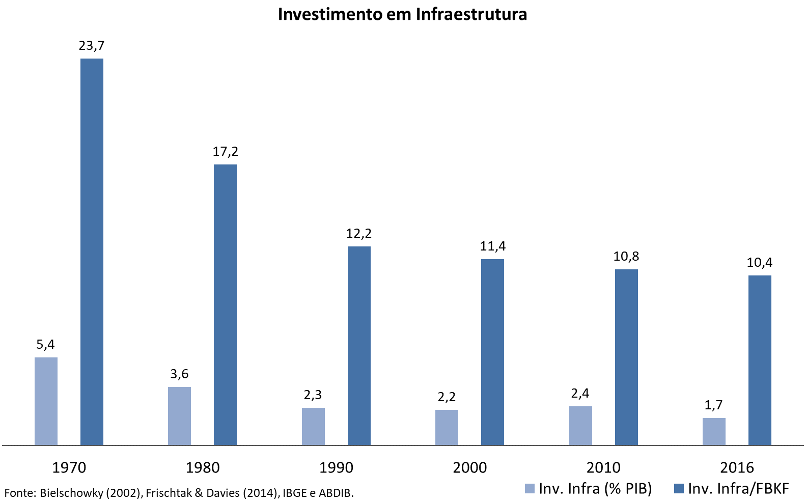 No Brasil, a relação investimento em infraestrutura/PIB tem sido aproximadamente de 2%, enquanto em outros emergentes destacados, como Índia e China, atinge 4% e 13% do PIB, respectivamente. Vale ressaltar que o Brasil saiu de um grande desenvolvimento do setor nos anos de 1970, quando investiu 5,4% do PIB, para menos da metade, 2,4% do PIB na década de 2000 e menos ainda na presente década. Os dados mostram que nos anos 1970 o investimento em infraestrutura correspondia a 24% da formação bruta de capital fixo brasileira, diminuindo para aproximadamente 11% nos anos 2000.