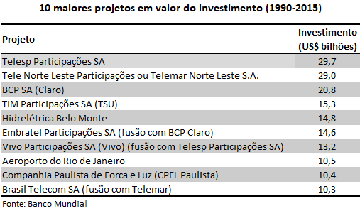 Breve Histórico de Concessões no Brasil. Entre 1990 e 2016 foram firmados 861 contratos com participação privada em investimentos em infraestrutura no país com um montante total de inversões de US$ 525,65 bilhões, segundo o Private Participation in Infrastructure 2017 do BANCO MUNDIAL. A participação privada envolveu os mais diversos segmentos: aeroportos, comunicação, gás natural, portos, ferrovias, rodovias, água e esgoto e eletricidade. Esse último contou com a maior parcela de investimentos (US$192,0 bilhões), seguido por comunicação (US$177,6 bilhões). Em termos de número de projetos com contratos firmados, o setor elétrico também lidera com 486 projetos, seguido por água e esgoto (148), rodovias (72) e portos (60). O gráfico abaixo mostra o volume de investimentos acumulado entre 1990 e 2016 por setor.