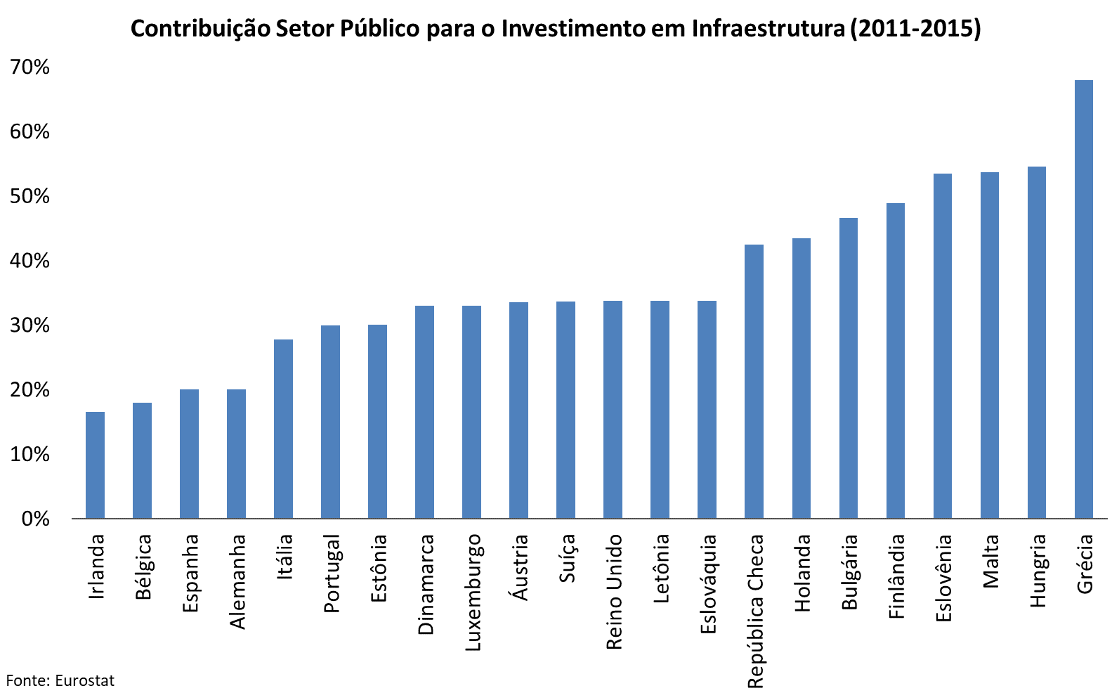 Uma análise comparativa entre países mostra que os governos desempenham papel de destaque como investidor e o Brasil deve acompanhar tal tendência na recuperação da infraestrutura brasileira. Parcerias público-privadas (PPPs) e concessões são essenciais e de extrema importância para a economia, contudo, muitos projetos não oferecem atratividade para os investidores. Por este motivo, como mostra o gráfico abaixo, mesmo em países desenvolvidos, a contribuição do investimento público na infraestrutura é significativa.