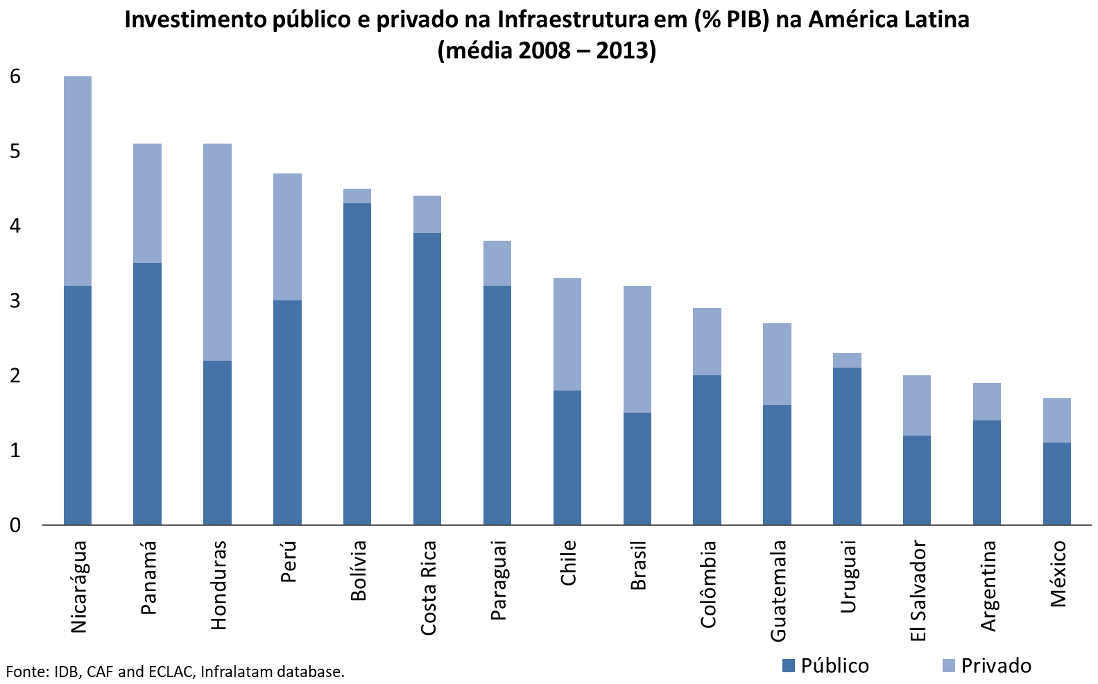 No Brasil, um dos poucos países da América Latina onde o investimento privado tem sido maior que o público, este último vem sofrendo queda acentuada, sem que o investimento privado tenha se apresentado compensatoriamente. Esse processo precisa ser estancado e revertido em prol do desenvolvimento da infraestrutura brasileira, sem que isso represente que o setor privado deixe de ter liderança na retomada do investimento da infraestrutura brasileira. Por isso, ao lado dos esforços para deslanchar as iniciativas privadas sob o modelo de concessões, é muito importante, também, que o setor público brasileiro recupere sua capacidade de atuação, seja como investidor ou como financiador da infraestrutura nacional.