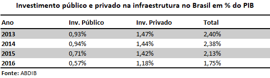 A Abdib estima que, para 2017, o investimento no setor correspondeu a apenas 1,5% do PIB, percentual inferior aos 1,75% de 2016 e muito abaixo da necessidade de 5% para a modernização da infraestrutura brasileira nos próximos 10 anos. Estes são números preocupantes para uma economia com a infraestrutura já bastante deteriorada.