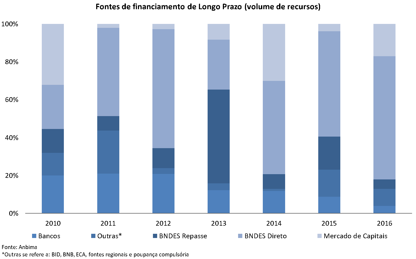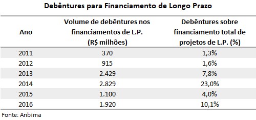 Financiamento. O BNDES, o principal financiador dos projetos de infraestrutura do país, apoia praticamente todos os segmentos da infraestrutura - energia, portos, aeroportos, rodovias, saneamento básico, entre outros. Os demais bancos de fomento, como a CEF e o Banco do Nordeste, têm participação inferior, mas também relevante. Já os instrumentos de mercado de capitais hoje são pouco representativos, mesmo com o advento das debêntures incentivadas, o mesmo valendo para os financiamentos através dos bancos privados. O BNDES concentrou 70% do total dos financiamentos de longo prazo na economia em 2016, enquanto o mercado de capitais respondia por apenas 13,7% dos financiamentos.