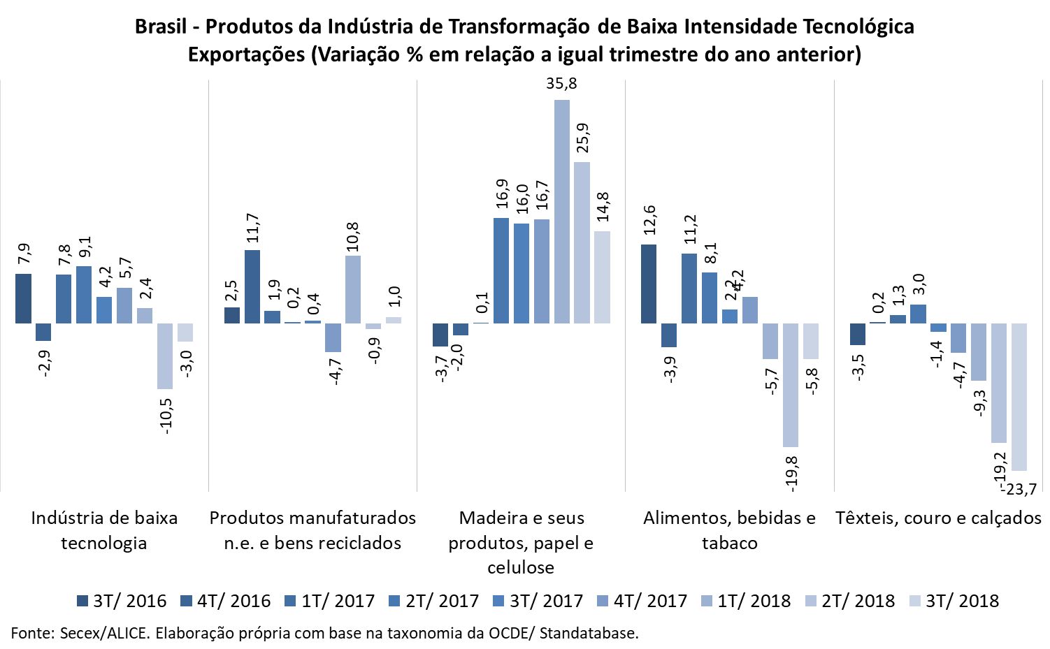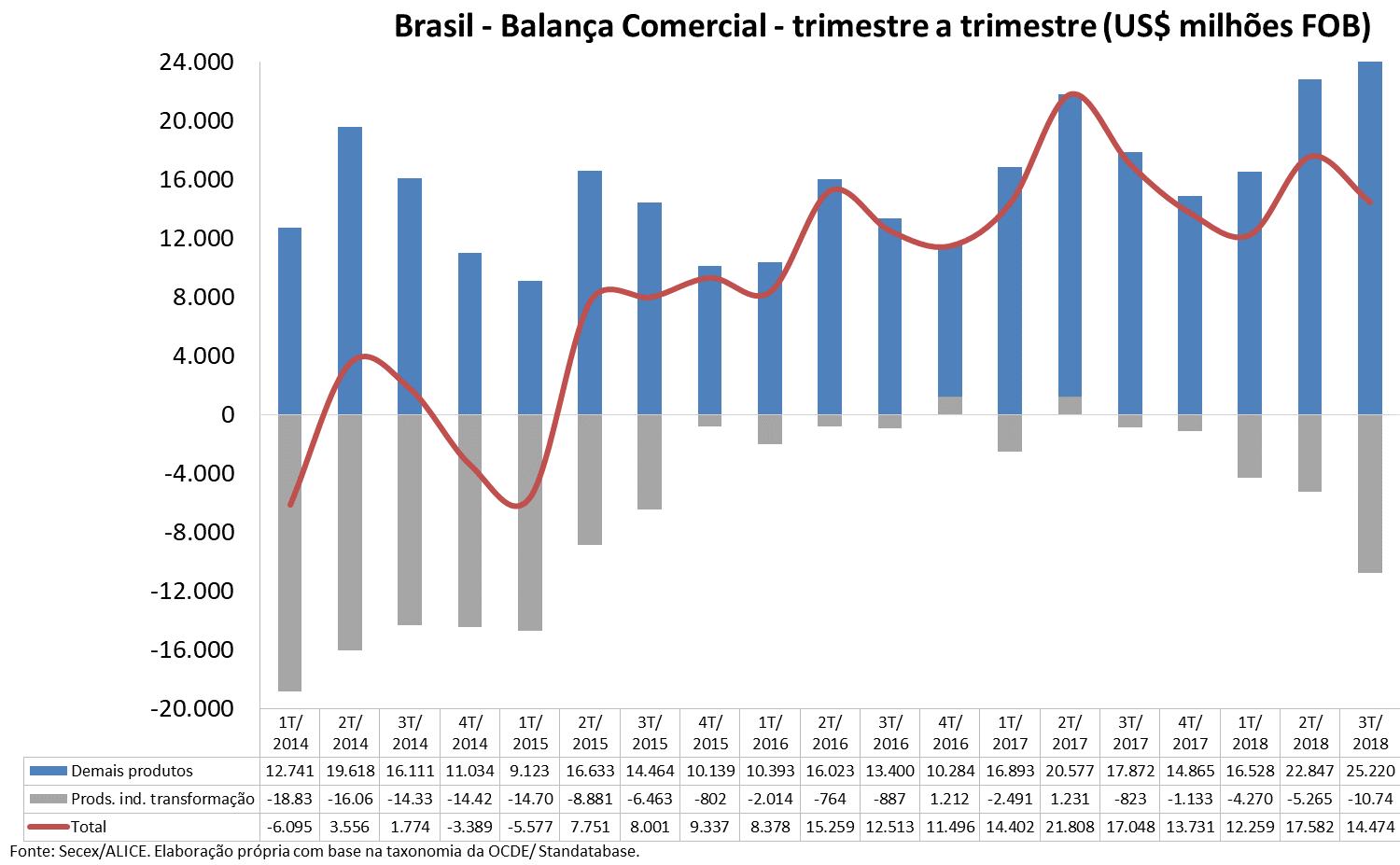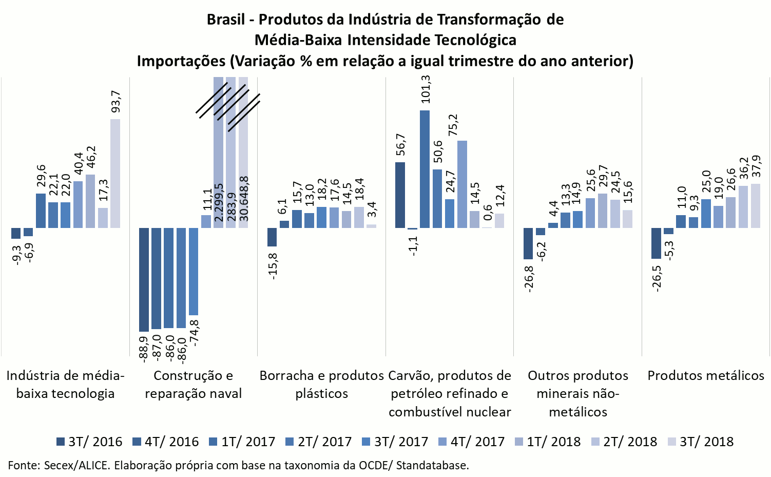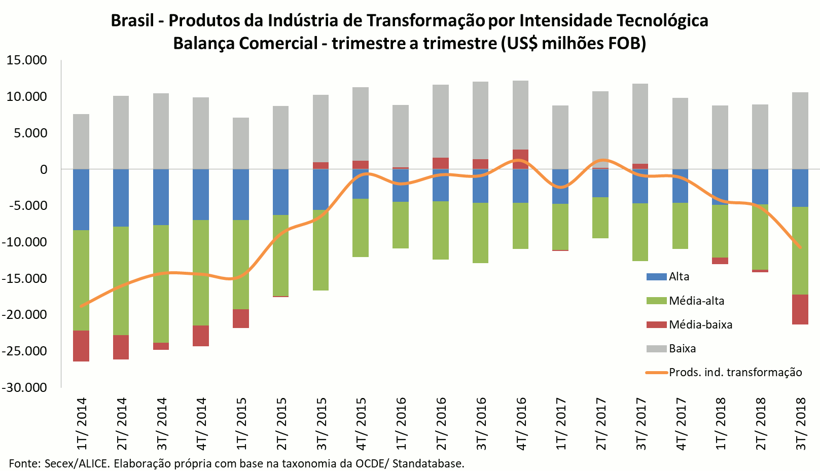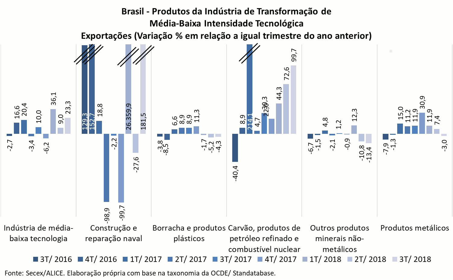 As exportações de gêneros típicos da indústria de média-baixa intensidade tecnológica cresceram 23,3% no terceiro trimestre de 2018 vis-à-vis julho-setembro de 2017, atingindo US$ 9,9 bilhões. As importações, também em dólares correntes, cresceram sobremaneira: 93,7%. Com isso a balança comercial do terceiro trimestre do ano ficou com déficit de US$ 4,1 bilhões, fazendo com que o acumulado do ano também ficasse deficitário.