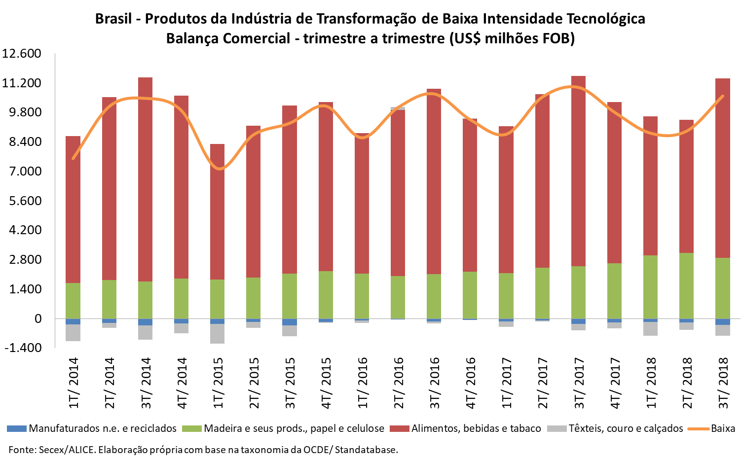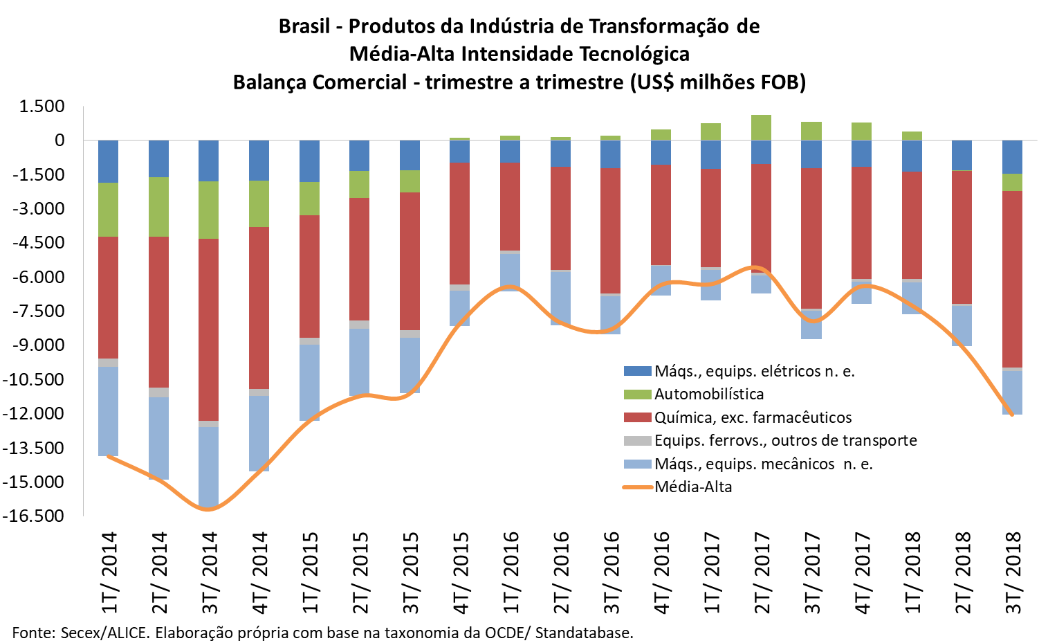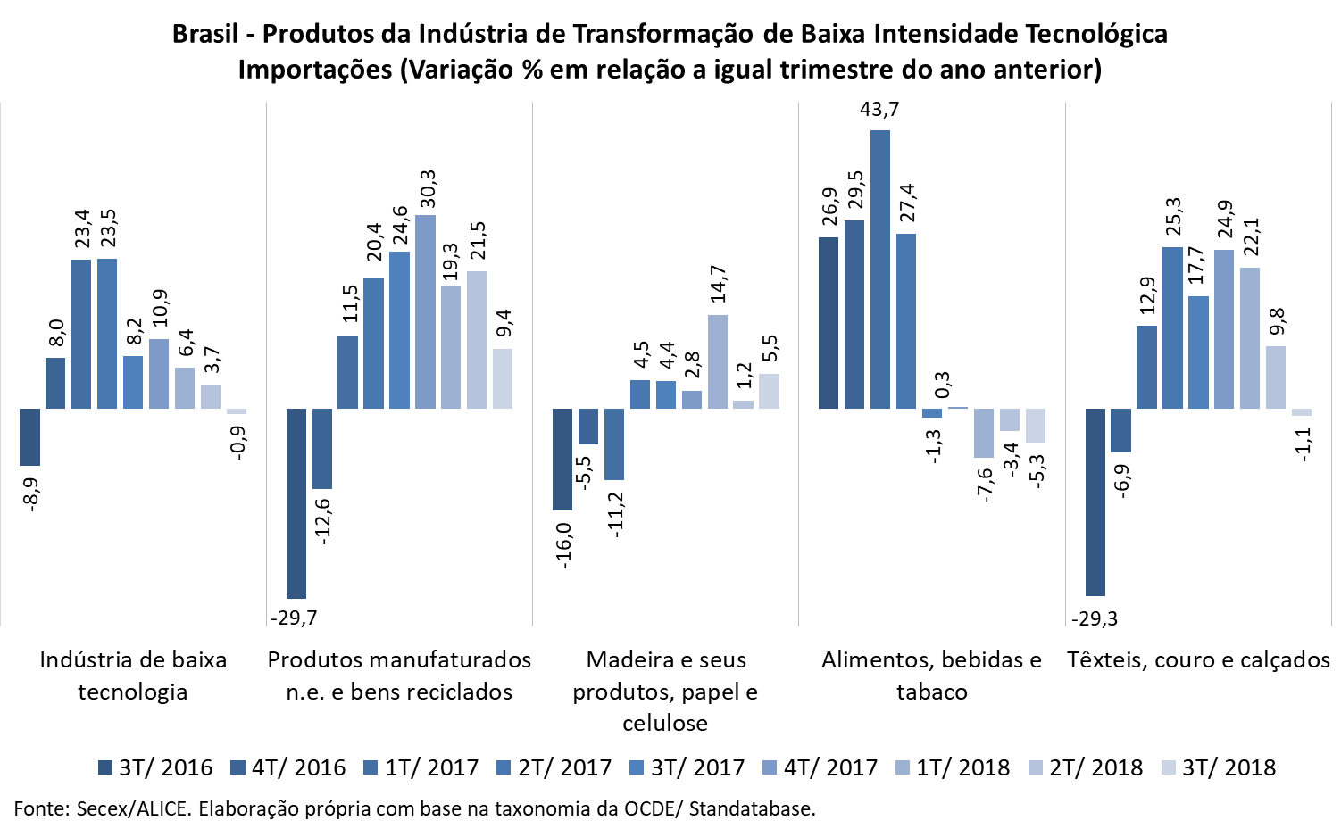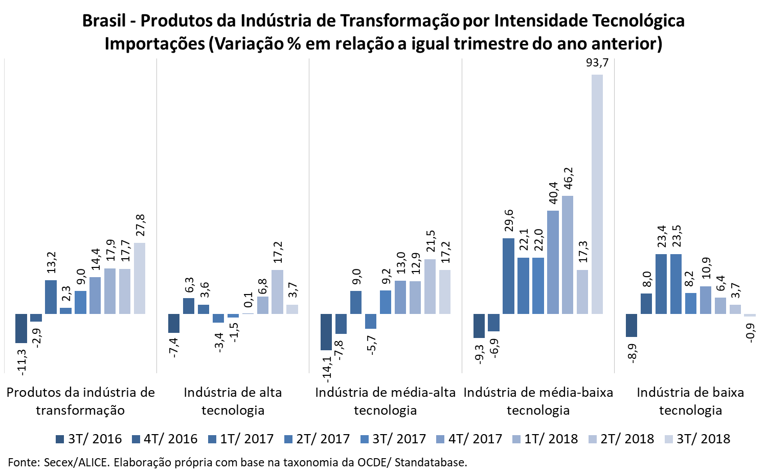 As exportações de gêneros típicos da indústria de média-baixa intensidade tecnológica cresceram 23,3% no terceiro trimestre de 2018 vis-à-vis julho-setembro de 2017, atingindo US$ 9,9 bilhões. As importações, também em dólares correntes, cresceram sobremaneira: 93,7%. Com isso a balança comercial do terceiro trimestre do ano ficou com déficit de US$ 4,1 bilhões, fazendo com que o acumulado do ano também ficasse deficitário.