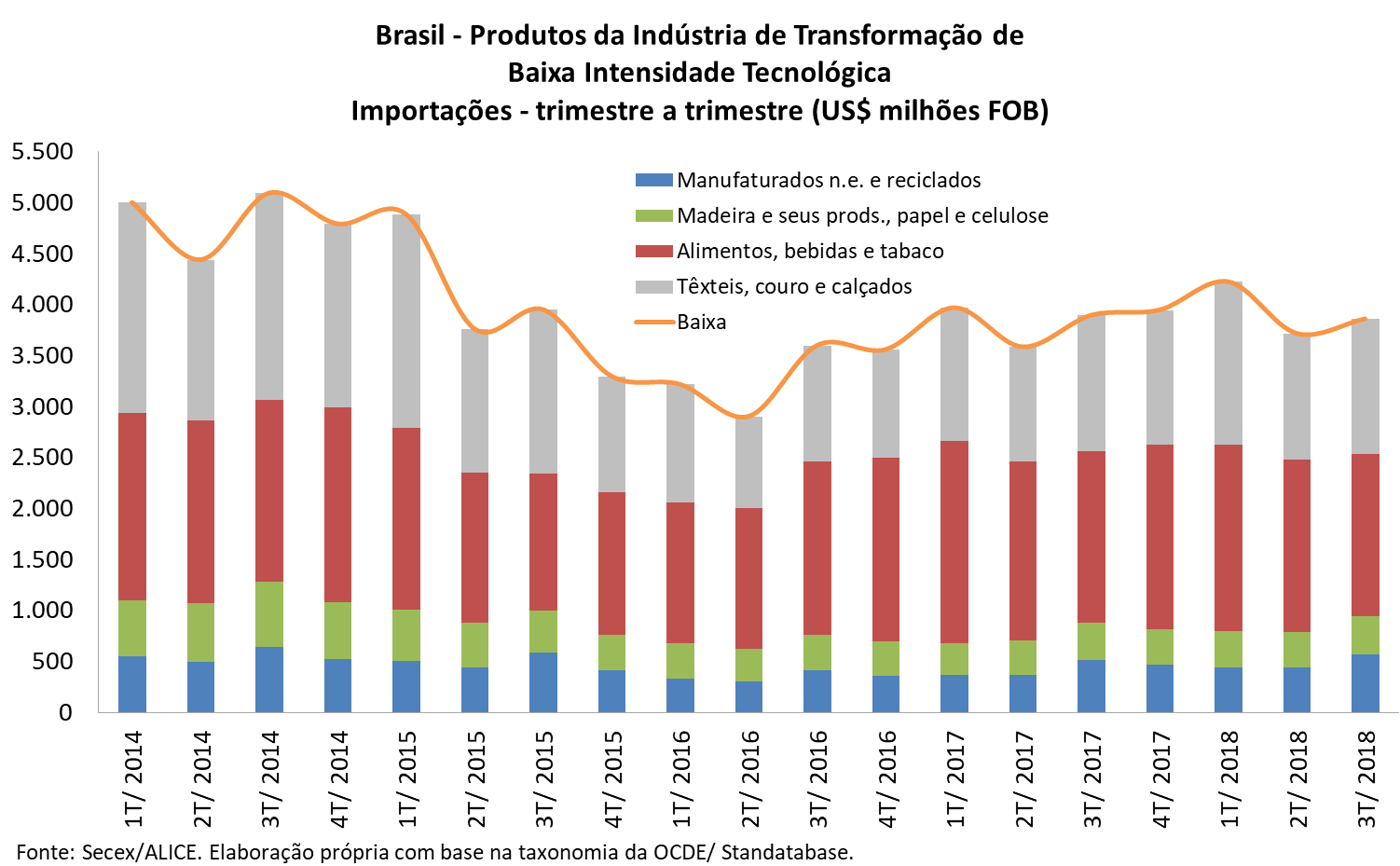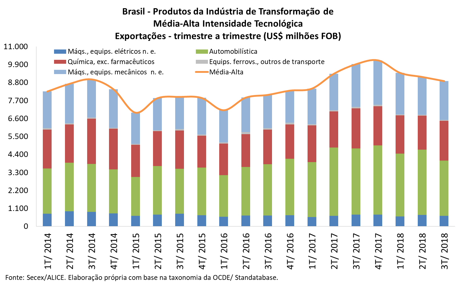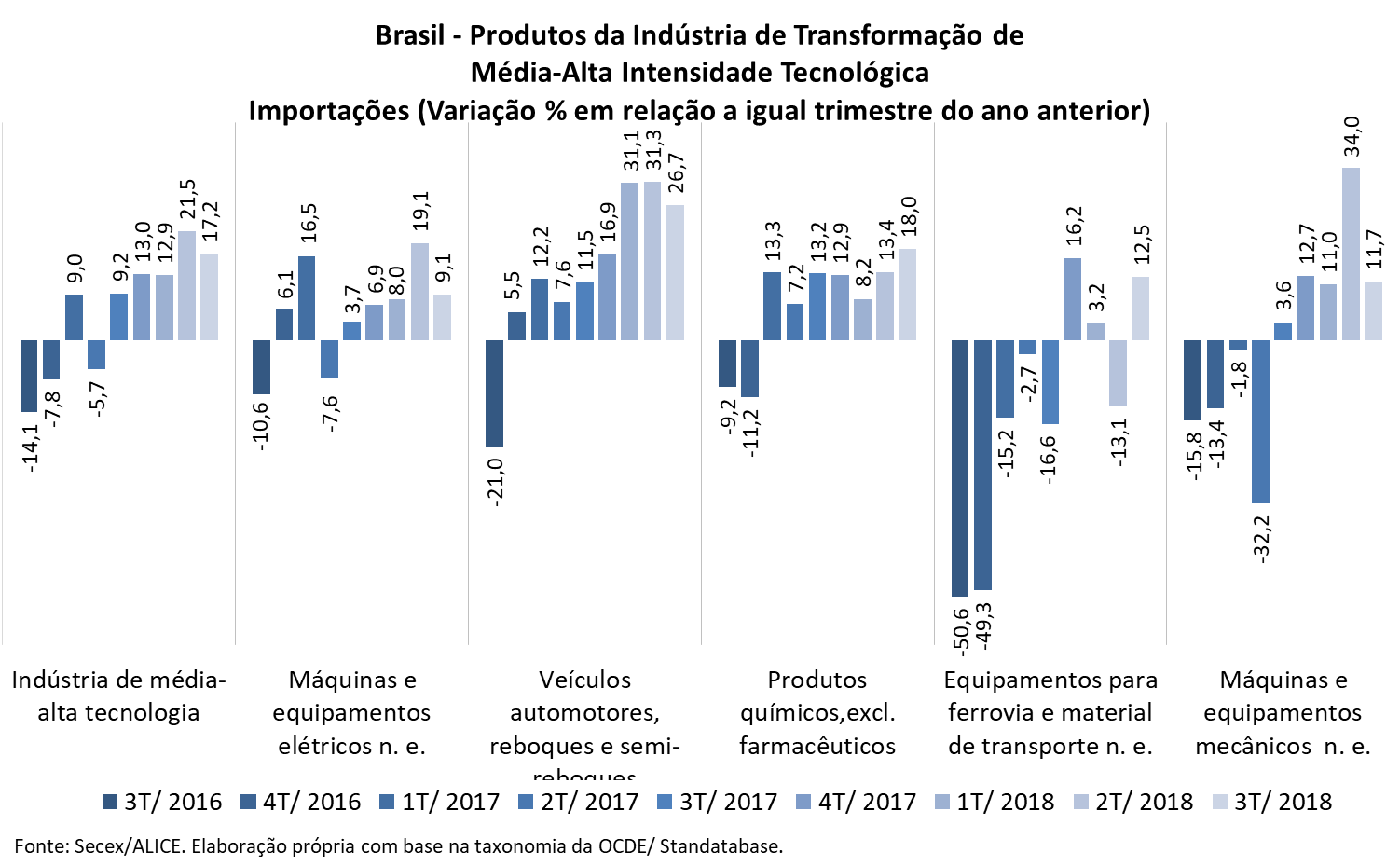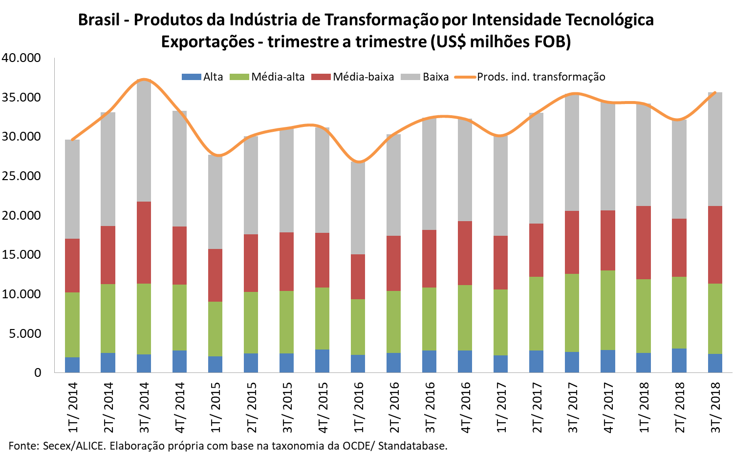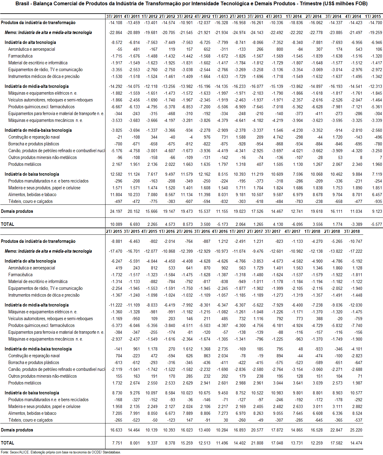 As exportações de gêneros típicos da indústria de média-baixa intensidade tecnológica cresceram 23,3% no terceiro trimestre de 2018 vis-à-vis julho-setembro de 2017, atingindo US$ 9,9 bilhões. As importações, também em dólares correntes, cresceram sobremaneira: 93,7%. Com isso a balança comercial do terceiro trimestre do ano ficou com déficit de US$ 4,1 bilhões, fazendo com que o acumulado do ano também ficasse deficitário.