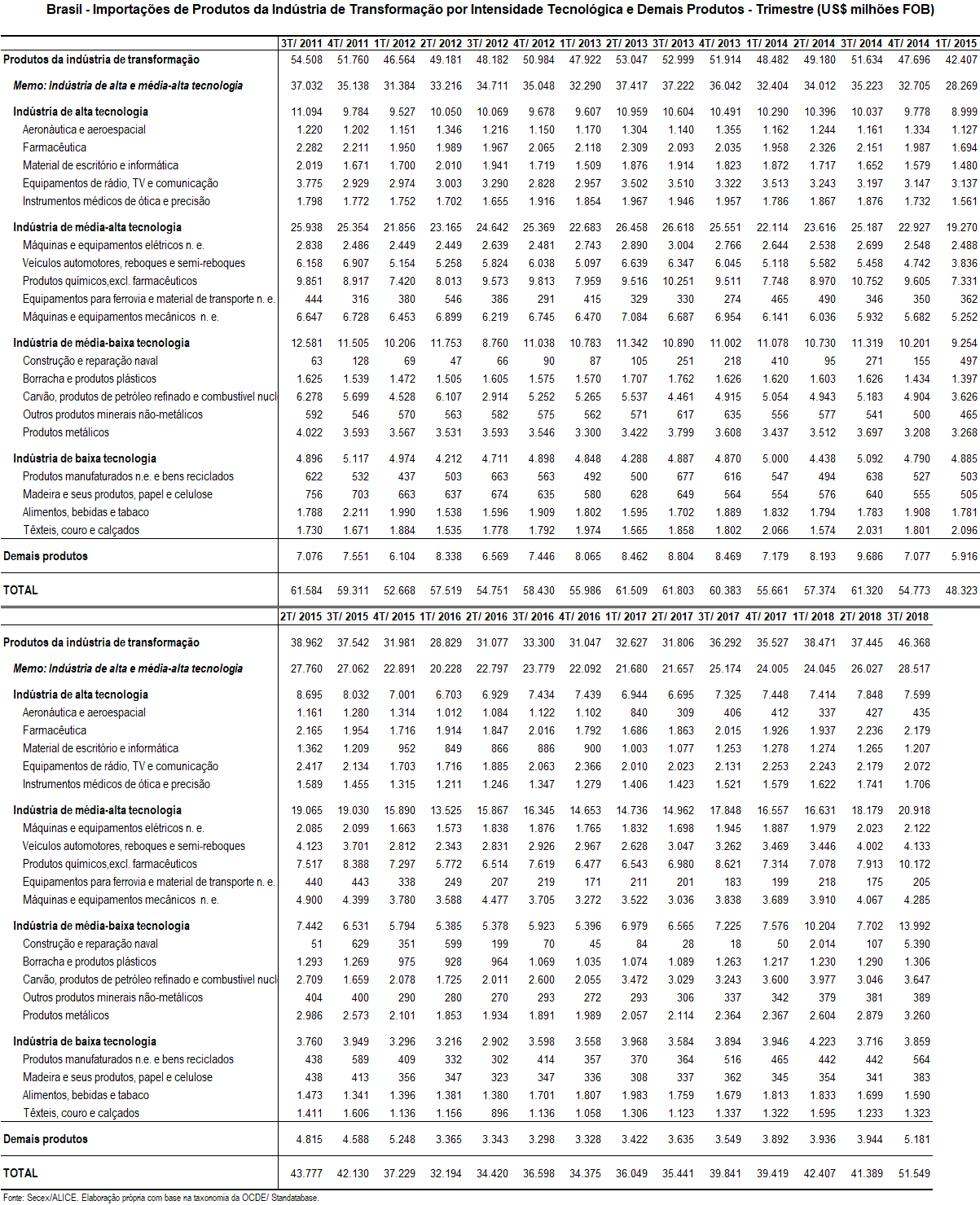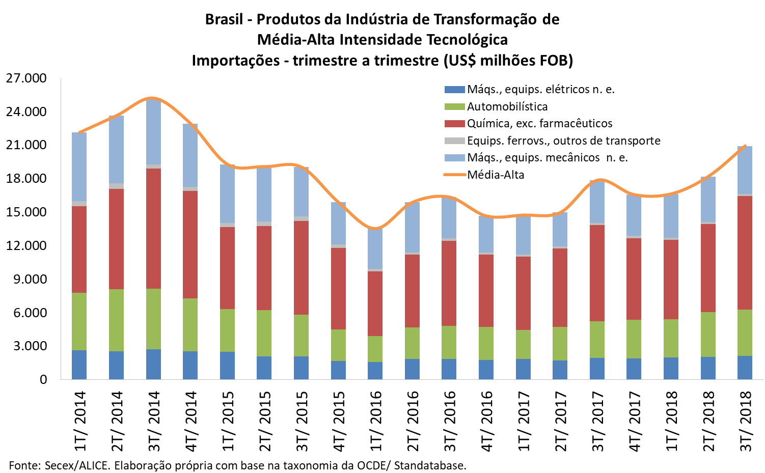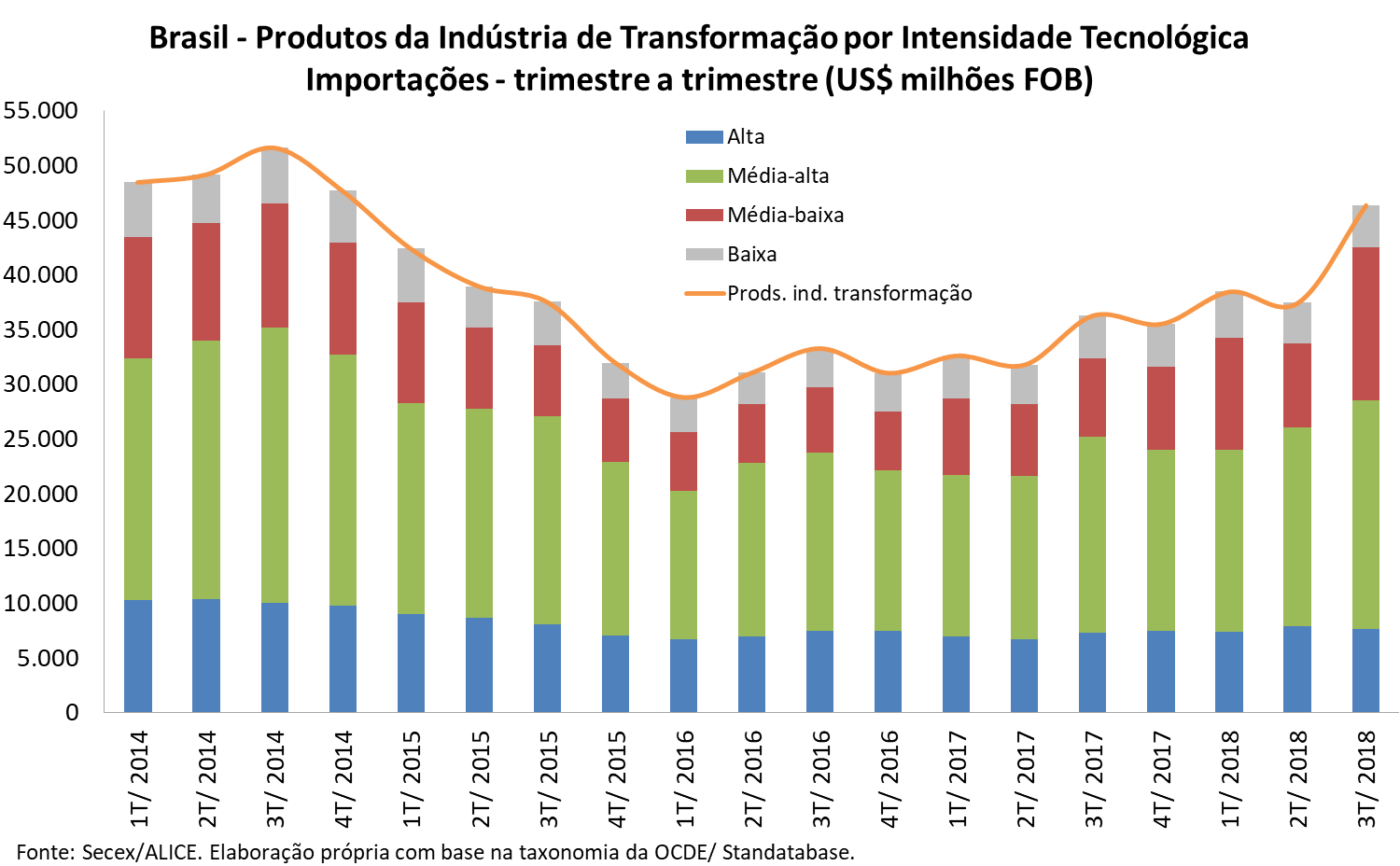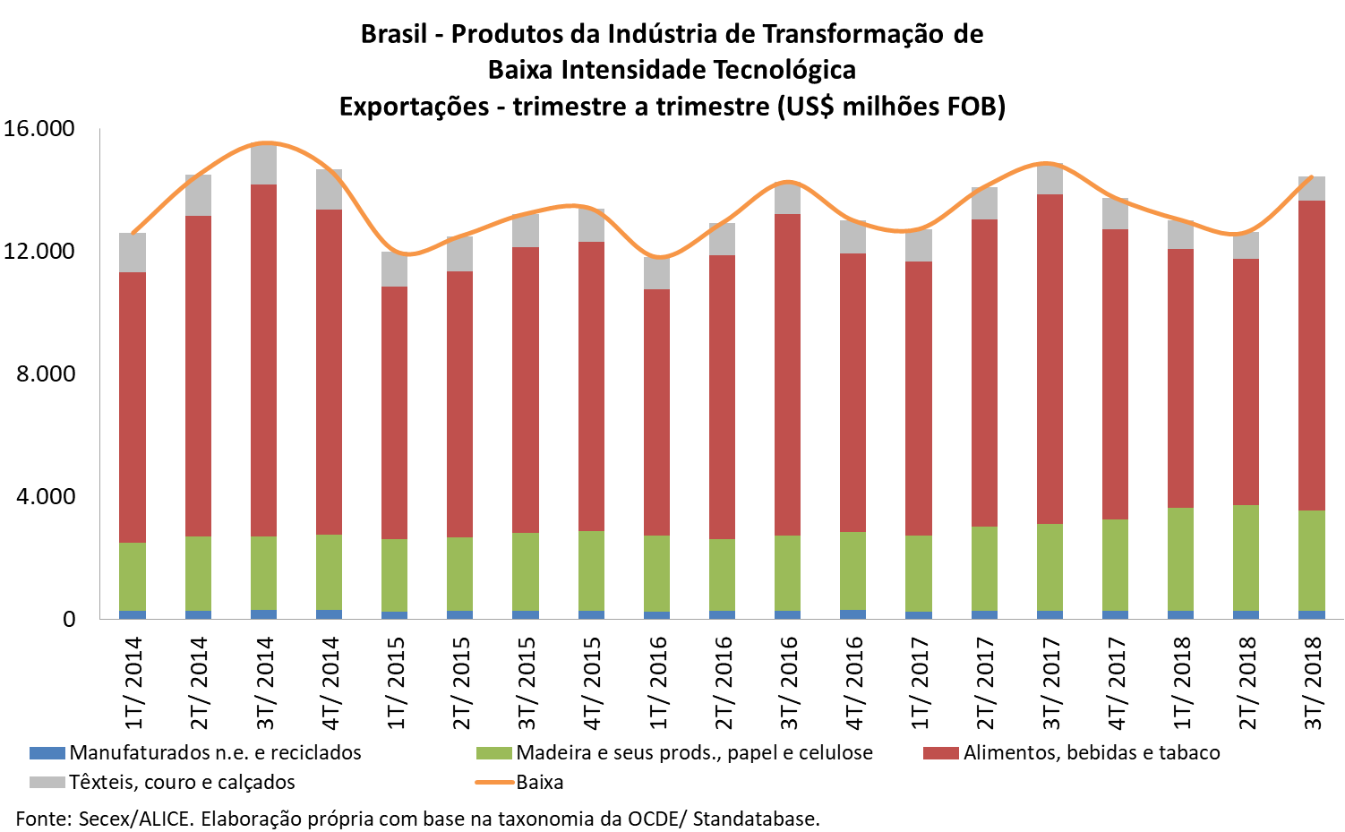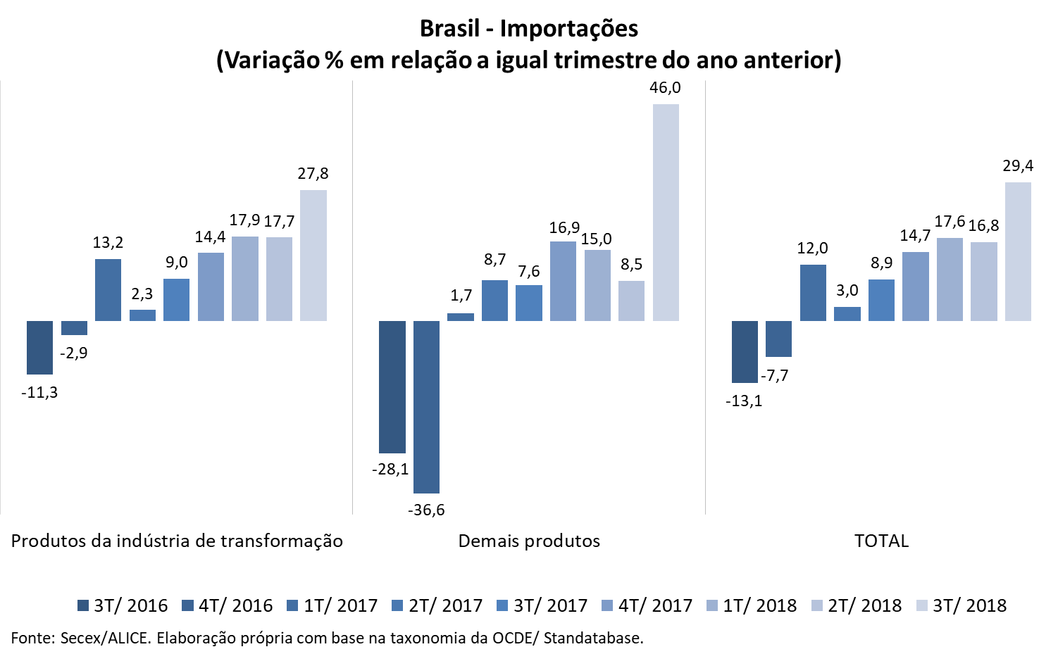 As exportações de gêneros típicos da indústria de média-baixa intensidade tecnológica cresceram 23,3% no terceiro trimestre de 2018 vis-à-vis julho-setembro de 2017, atingindo US$ 9,9 bilhões. As importações, também em dólares correntes, cresceram sobremaneira: 93,7%. Com isso a balança comercial do terceiro trimestre do ano ficou com déficit de US$ 4,1 bilhões, fazendo com que o acumulado do ano também ficasse deficitário.