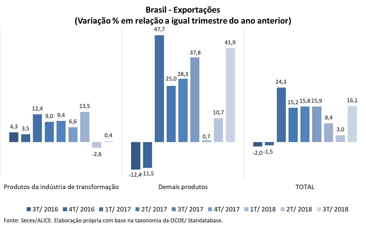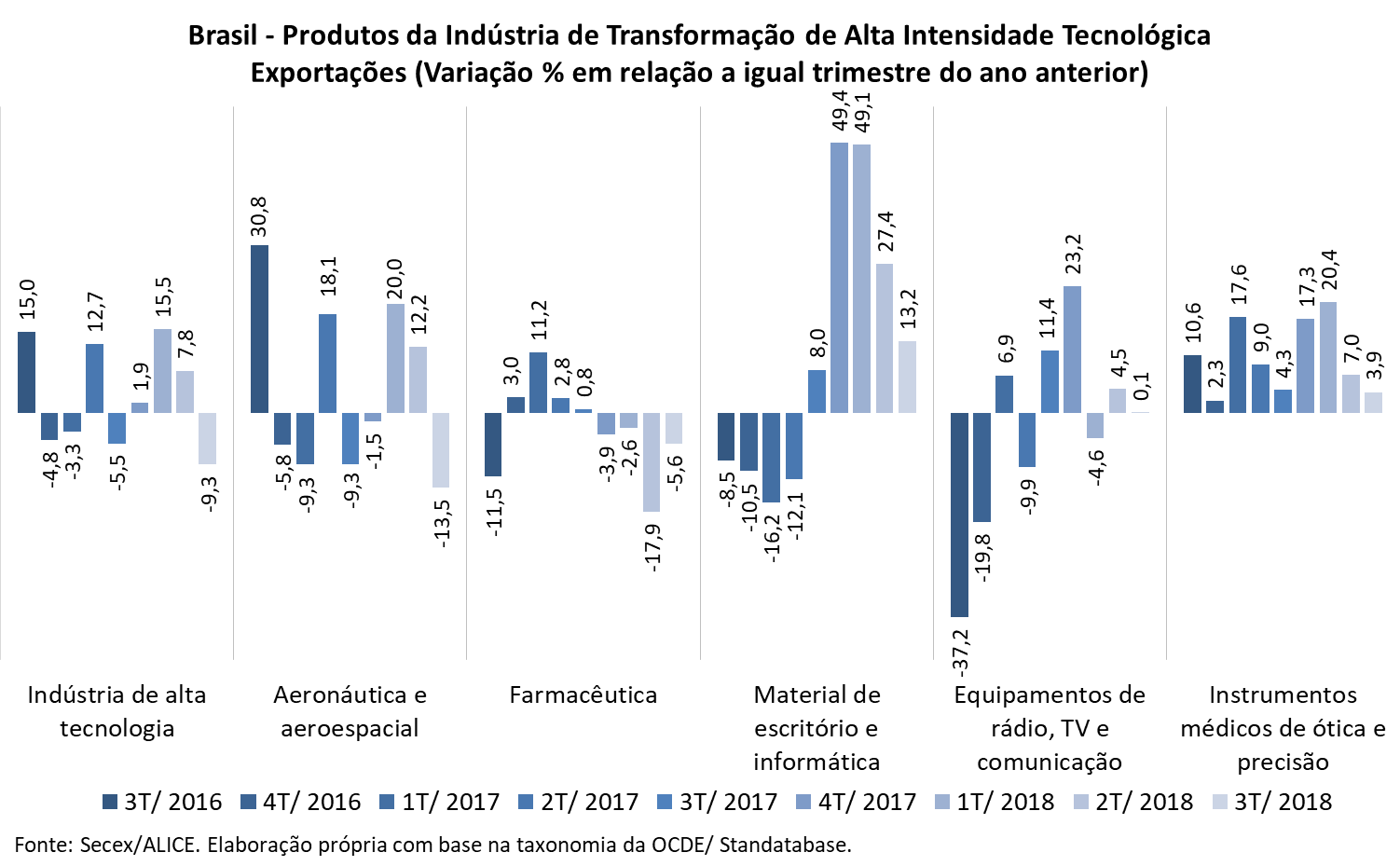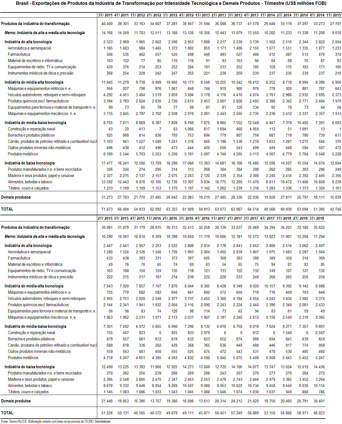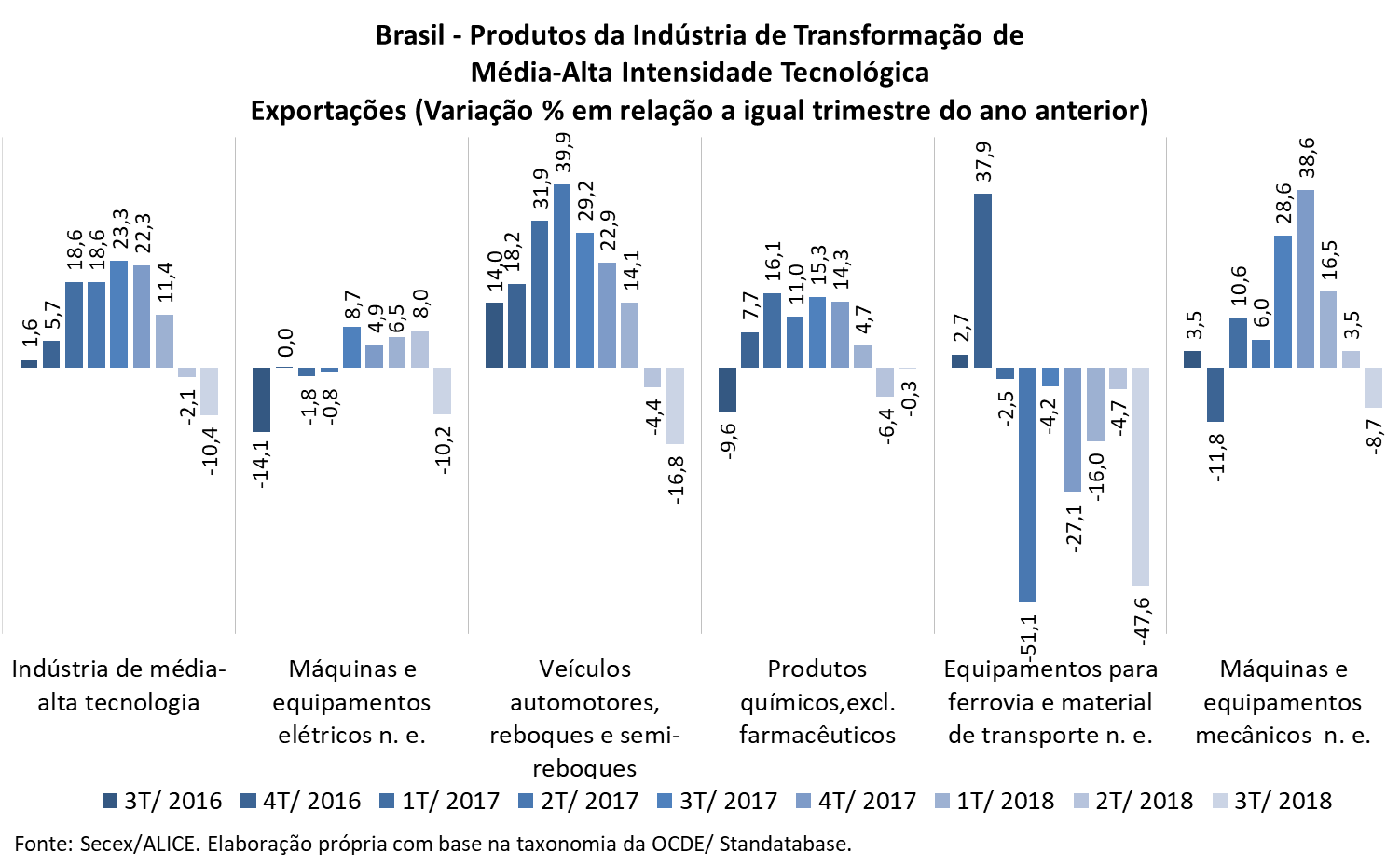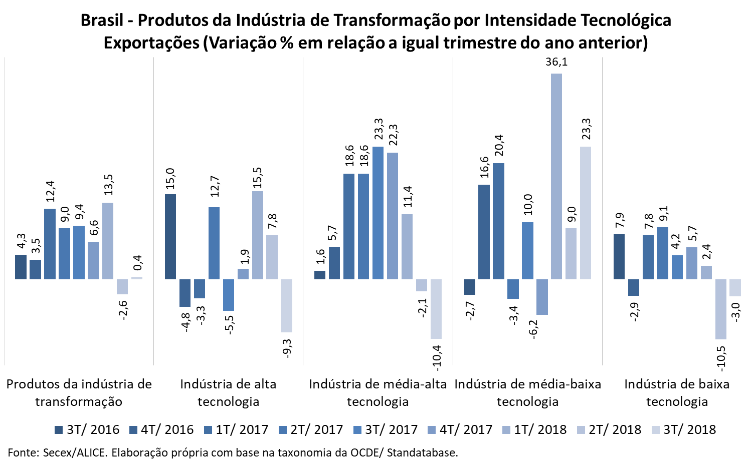As exportações de bens manufaturados, depois de ter registrado declínio de 2,6% no segundo trimestre de 2018, ante mesmo período do ano anterior, variou apenas +0,4% no acumulado entre os meses de julho e setembro, implicando uma virtual estabilidade exportadora no terceiro trimestre do ano. Este desempenho agregado esconde, contudo, o fato de que a grande maioria dos grupos de setores industriais por intensidade tecnológica tenha, na verdade, ficado no vermelho.