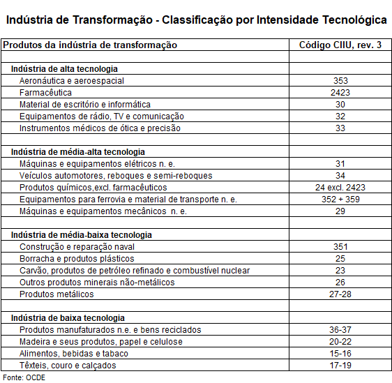 Tomando a classificação adotada pela OCDE para a indústria de transformação segundo a intensidade tecnológica, pode-se esmiuçar as relações de troca do País. Nela, a indústria de transformação é dividida em quatro faixas: de alta intensidade, de média-alta, média-baixa e de baixa intensidade tecnológica. A tabela a seguir discrimina melhor esses segmentos.