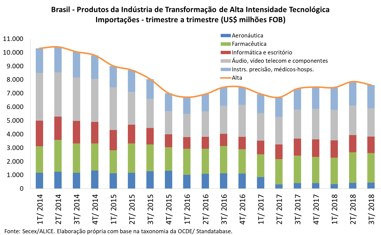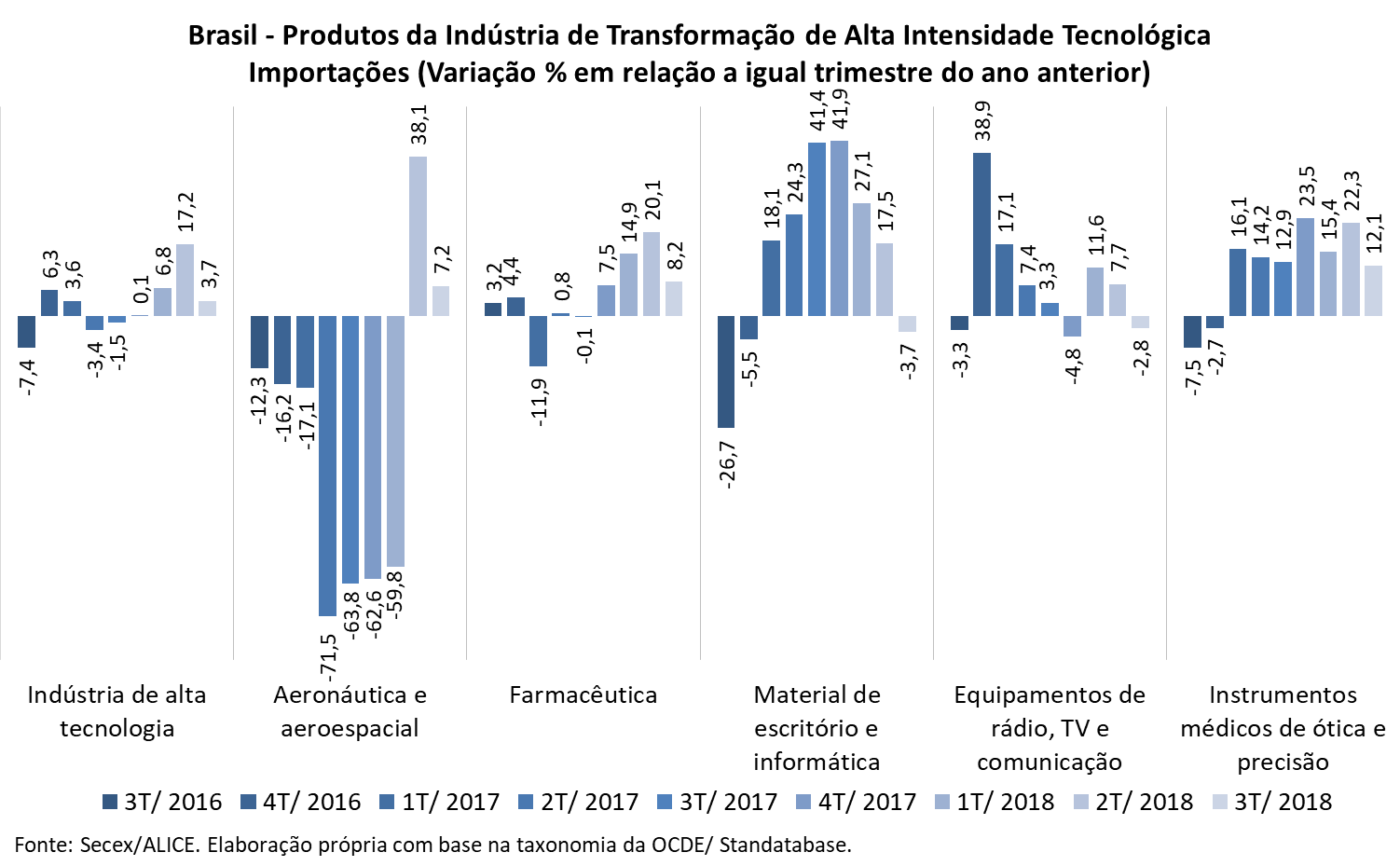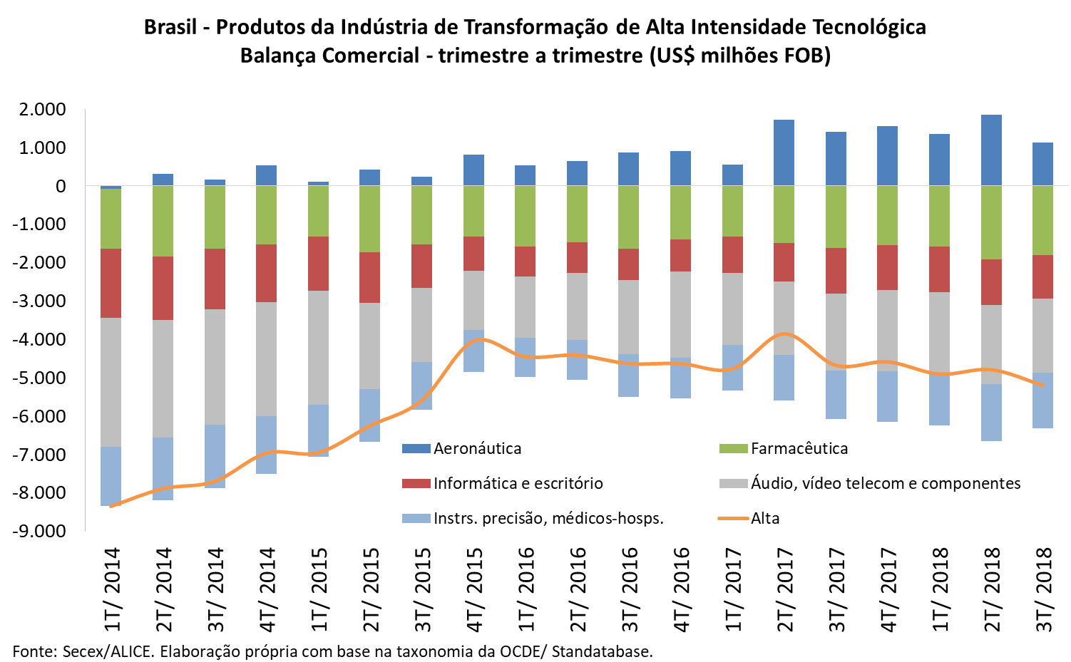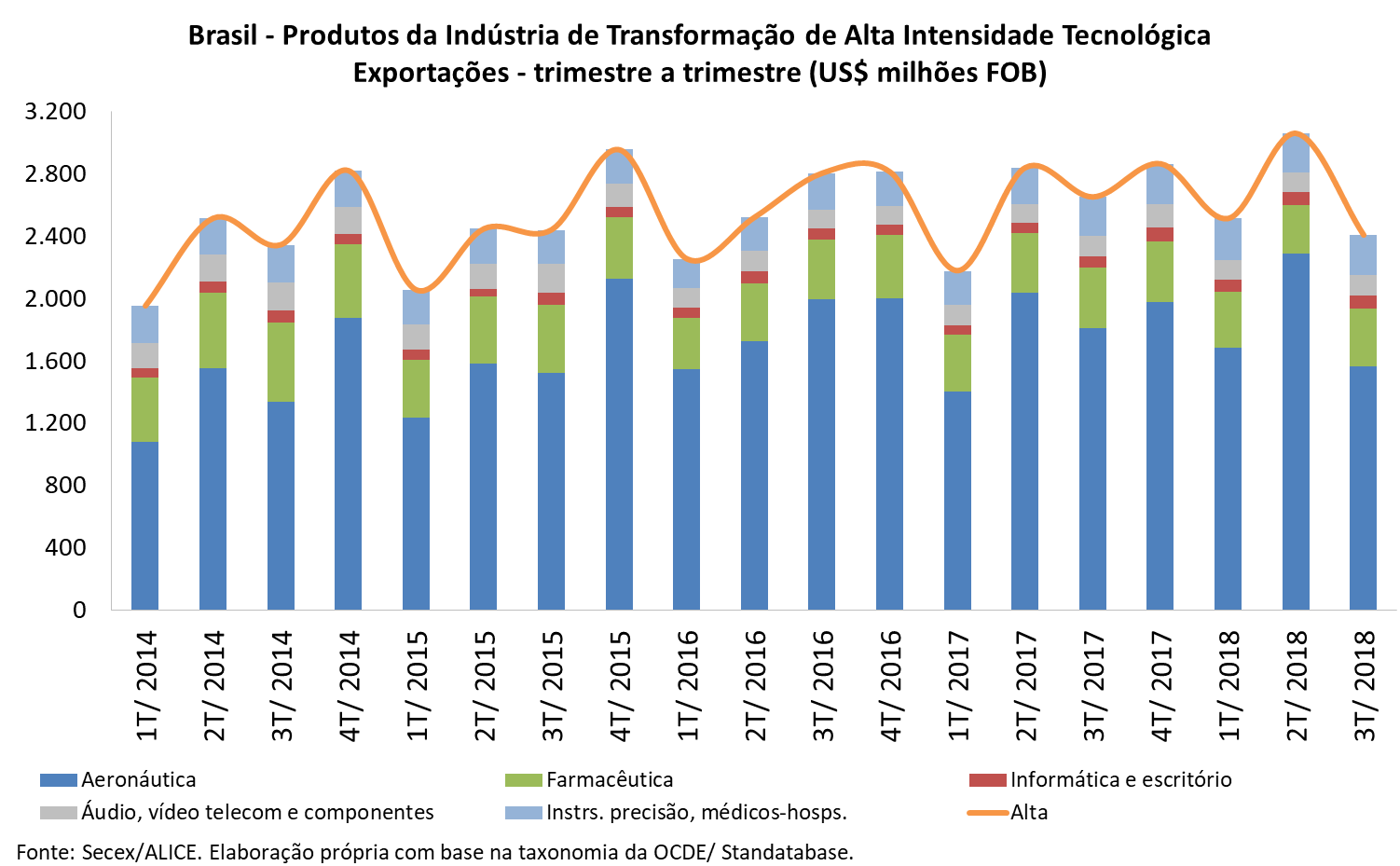 O intercâmbio externo de bens produzidos por atividades tidas pela OCDE como de alta intensidade tecnológica teve déficit de US$ 5,2 bilhões em julho-setembro do ano, quase retornando ao patamar deficitário do mesmo trimestre de 2015. As exportações diminuíram vis-à-vis os dois trimestres anteriores de 2018, afora terem recuado 9,3% frente ao mesmo trimestre de 2017, situando-se em montante bem aquém das demais faixas de intensidade. Os produtos da indústria aeronáutica mantêm a condição de únicos superavitários do segmento, mas suas vendas externas caíram pelo contraponto entre iguais trimestres de 2017.