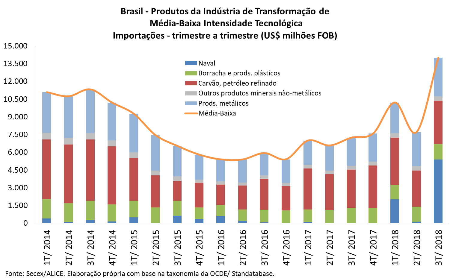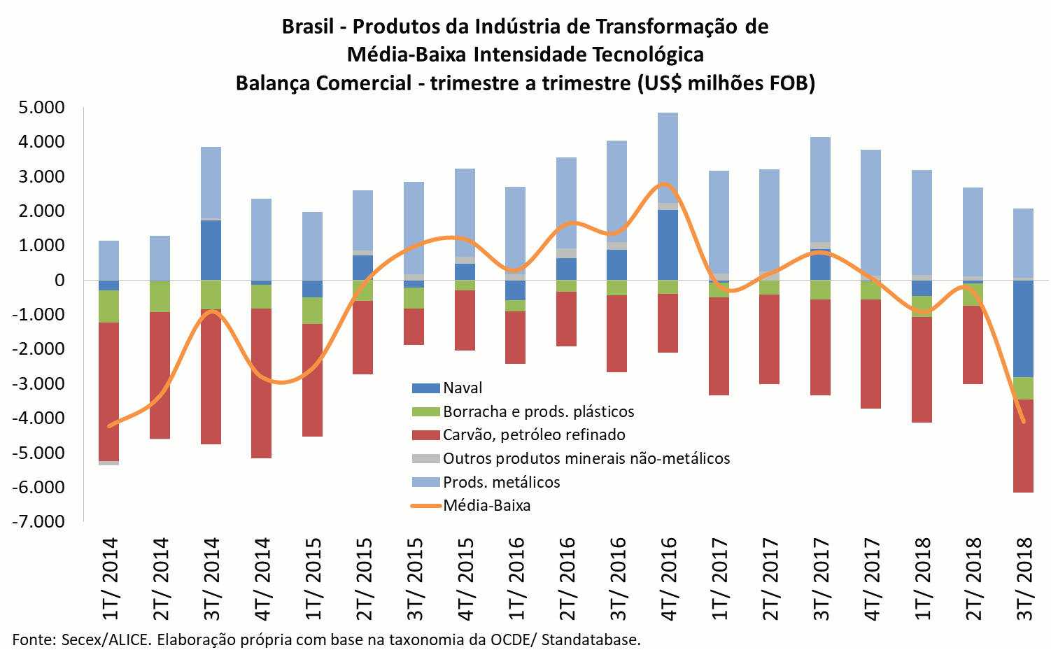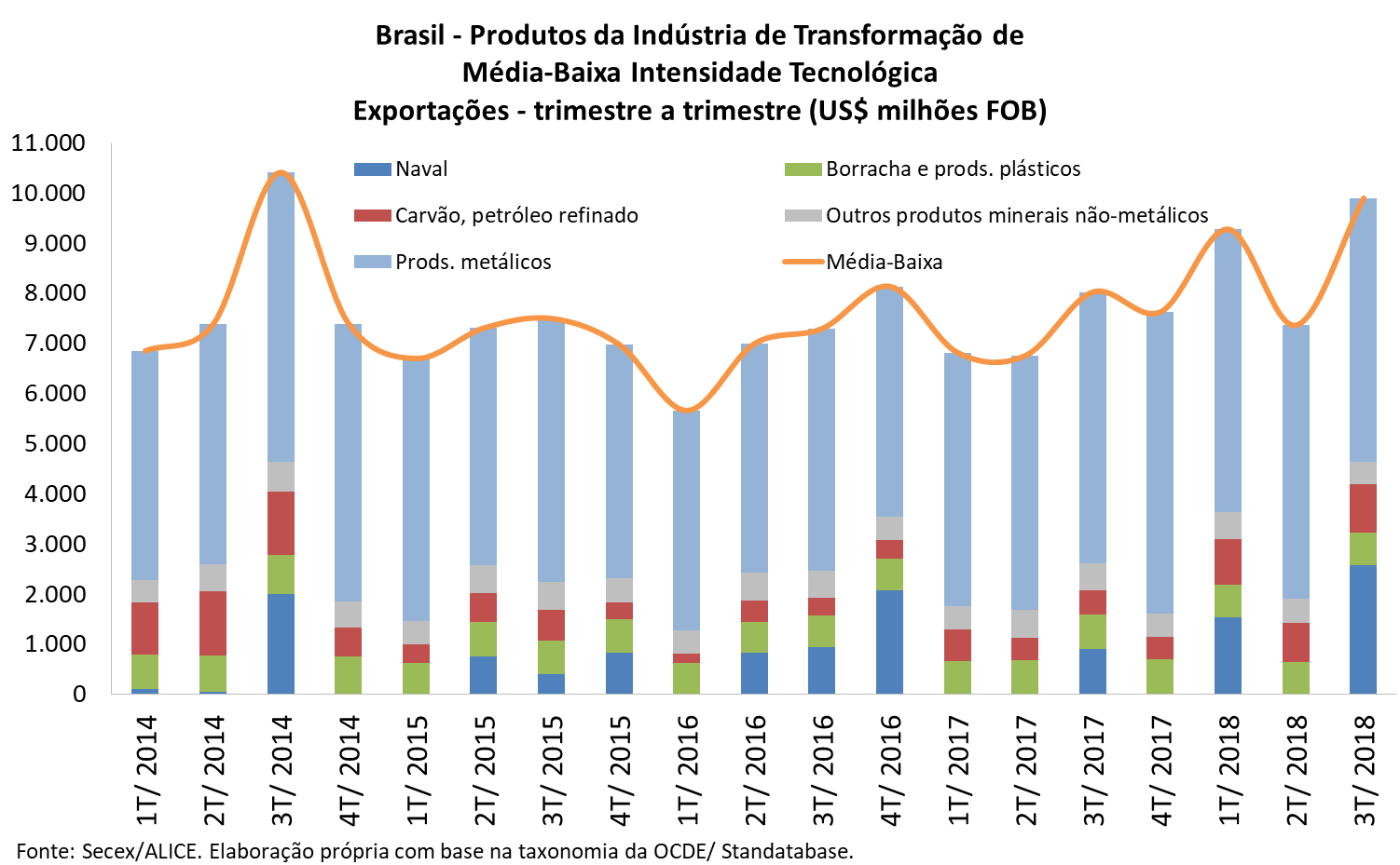 O intercâmbio dos produtos típicos das indústrias de média-baixa intensidade tecnológica é normalmente muito afetado por dois ramos de mercadorias: produtos metálicos, destacando-se a siderurgia; e bens derivados de petróleo refinado, outros combustíveis e afins. Como será visto logo abaixo, a construção naval representou uma mudança nesses determinantes, pelo menos no que tange ao terceiro trimestre de 2018.