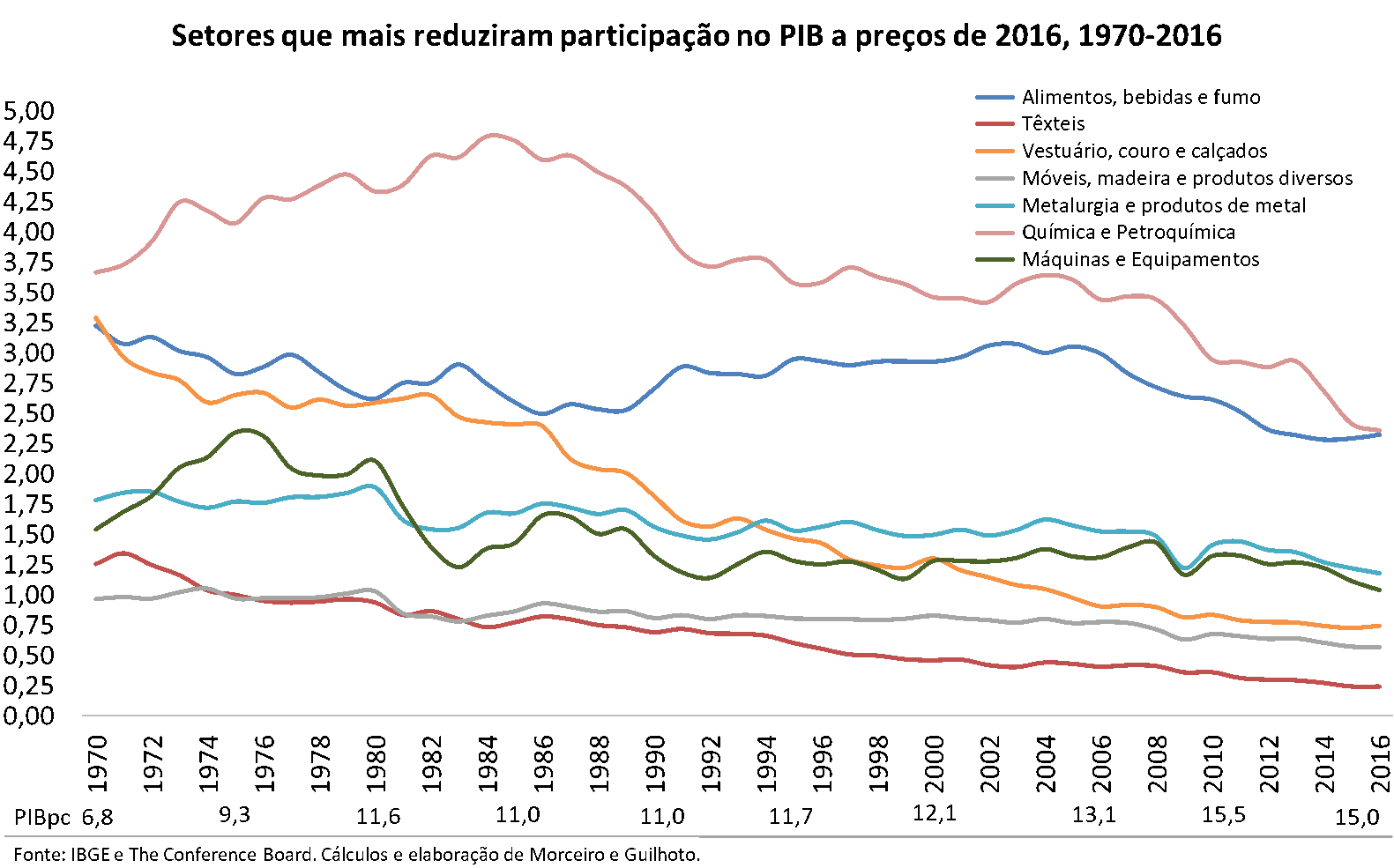 Os gráficos a seguir exibem a participação dos setores manufatureiros no PIB do Brasil de 1970 até 2016. A avaliação de Morceiro e Guilhoto, feita a seguir, sobre o formato das curvas setoriais ao longo do tempo procura levar em conta o padrão observado de mudança estrutural setorial, exibido na tabela anterior, que relaciona a participação setorial no PIB e o nível de renda per capita dos países.