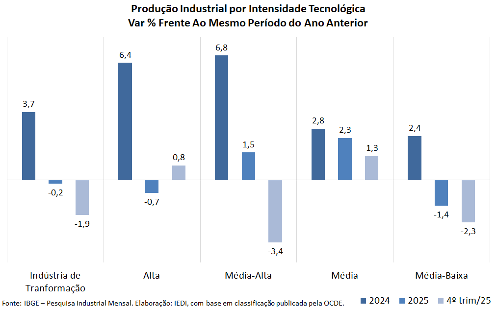 A maior reviravolta, contudo, se deu na indústria mais intensiva em tecnologia, saindo de um ritmo acima de +6% em 2024 para -0,7% no caso da alta e para +1,5% na média-alta, que atingiu -3,4% no 4º trim/25.